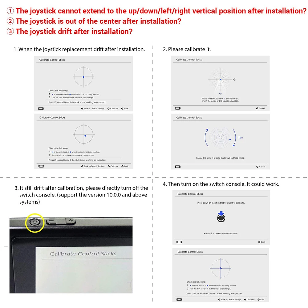 Аналоговая палка была протестирована каждый по одному перед отправкой.Прежде чем начать заменять, пожалуйста, лучше посмотрите видео-гид на Youtube.Когда вы берете нерабочие аналоговые палки от контроллера joy con.Сначала откройте замок с черной пряжкой, а затем используйте пинцет, чтобы поместить новую аналоговую головку кабеля в гнездо и. (Не подключайте и не отключайте головку кабеля слишком много раз. Если слишком много раз, это может повредить аналоговый кабель)После установки, пожалуйста, откалибруйте!Будьте внимательны и будьте терпеливы! Большое спасибо за внимание!