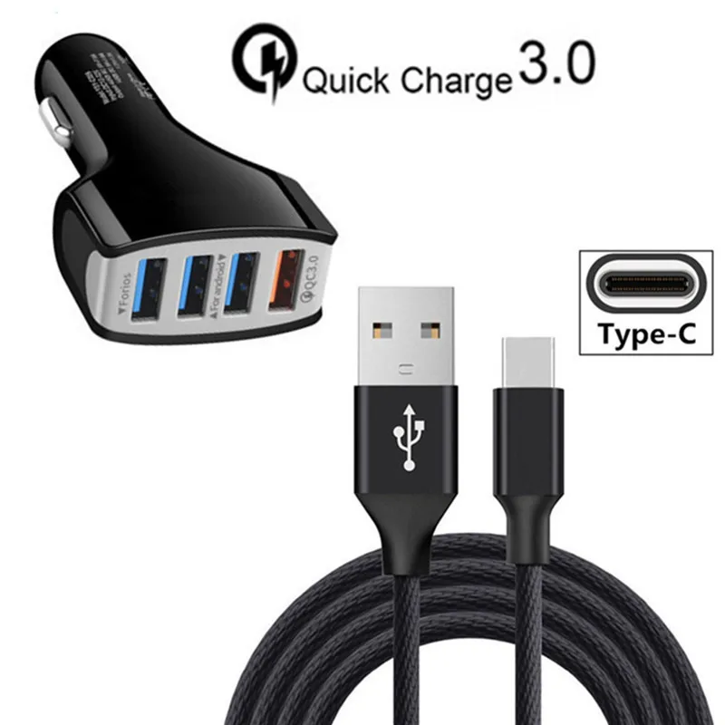 Быстрое Автомобильное зарядное устройство QC 3,0, 4 USB-порта, Тип C, USB-зарядное устройство, нейлоновый кабель для телефона Huawei p9, p10, p20 lite, mate 9, 10 pro, honor 9, 8 view, 10