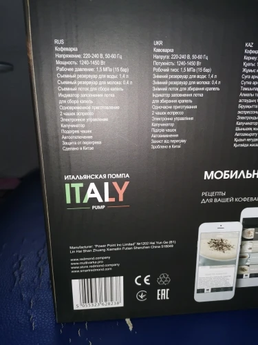 всё пришло целым и рабочим, хотя упаковка обычная стренч плёнка. Есть инструкция на русском языке. Из + готовит всё , что есть в описании. Можно изменять заводские настройки. Подача молока из любой тары. Из - во время готовки треск от работы помпы, очень много шума.