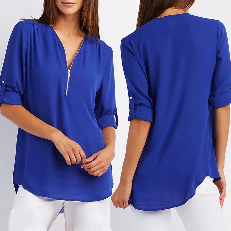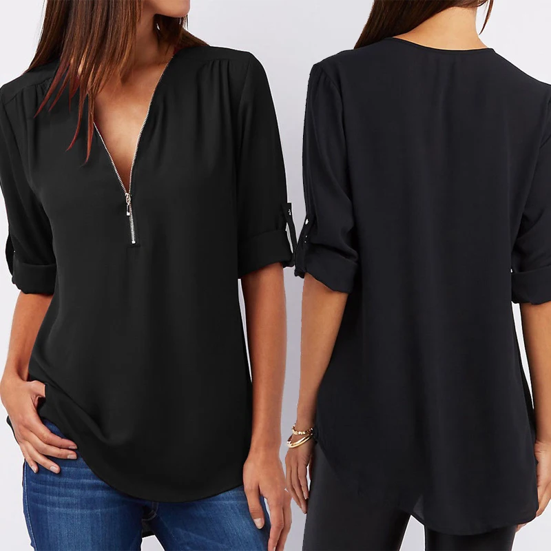 Женская шифоновая блузка с V-образным вырезом, лето-осень, повседневные однотонные Топы с коротким рукавом, свободные блузки на молнии, размера плюс
