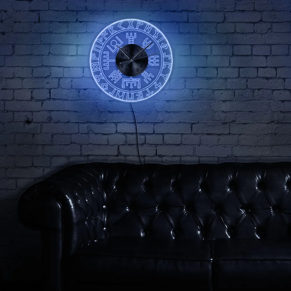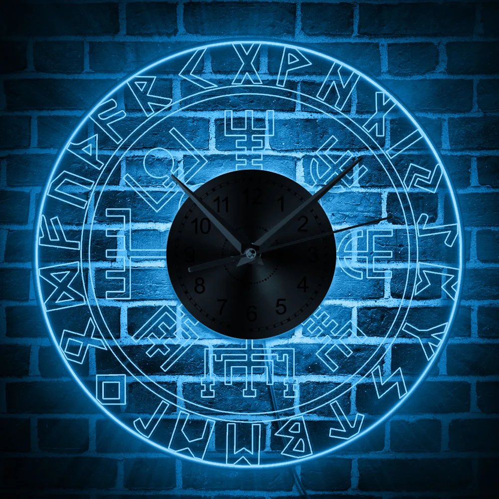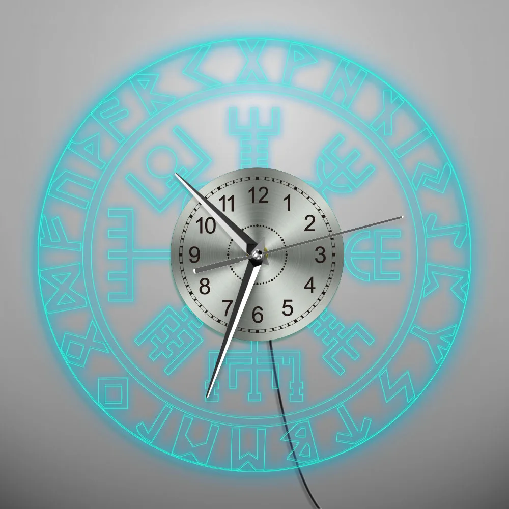 Скандинавские Светящиеся Настенные часы с компасом, руны викингов, акриловые светодиодные настенные часы с подсветкой по краям, мужская пещера, световой знак