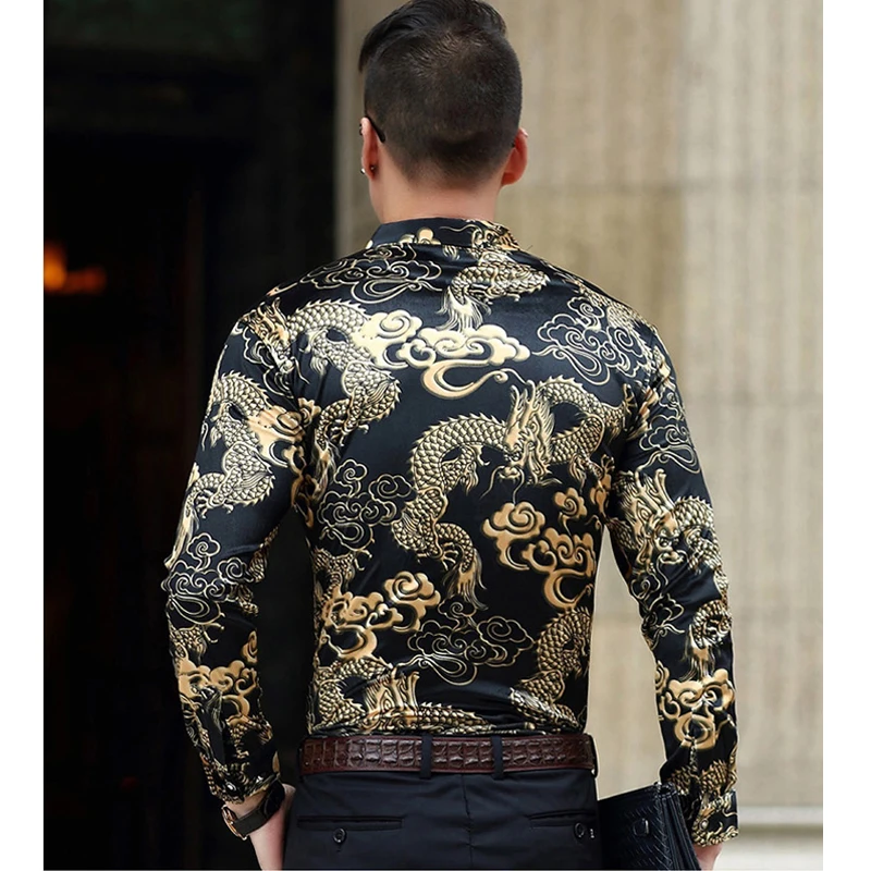 Модная мужская Роскошная брендовая шелковая рубашка хорошего качества в китайском стиле с рисунком дракона велюровая Мужская рубашка под смокинг