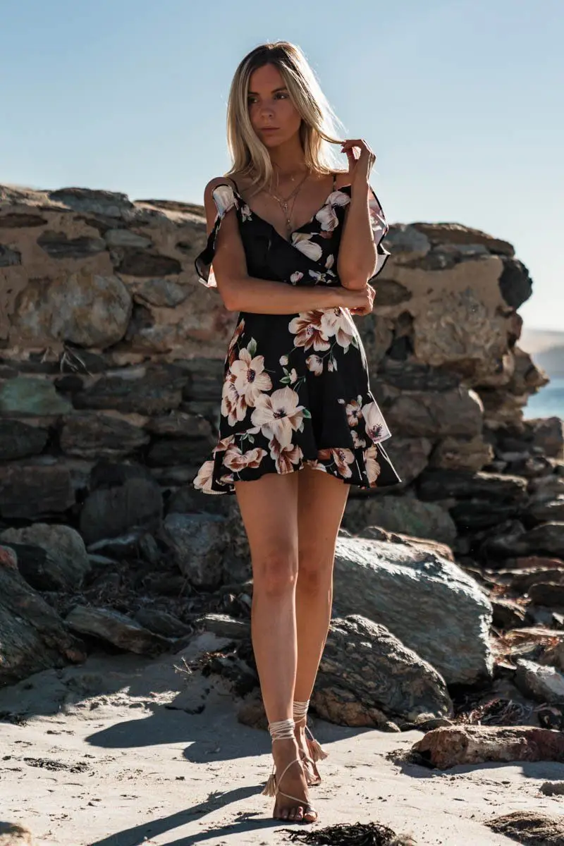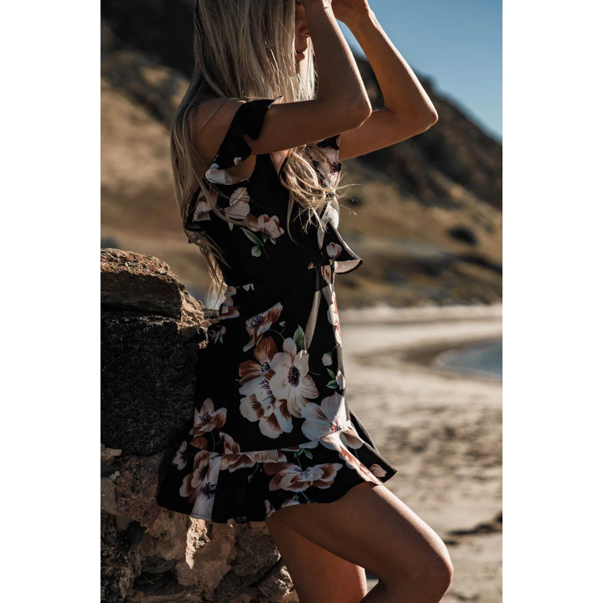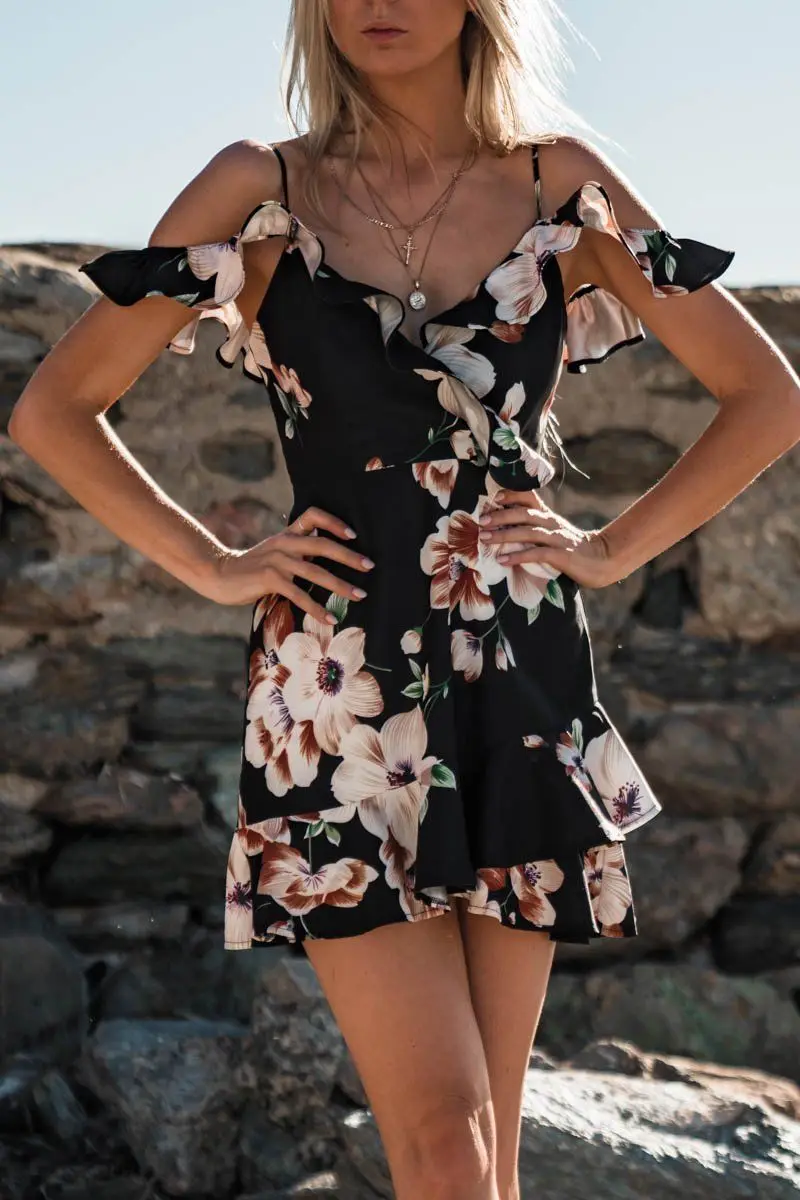 Женский пляжный сарафан с цветочным принтом, шифоновый вечерний элегантный короткий мини-сарафан в стиле бохо, с оборками по подолу, дорожное платье, на лето