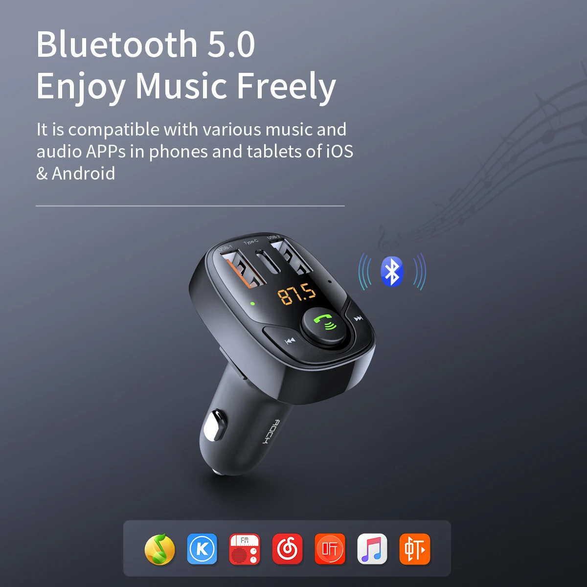 Автомобильный FM-передатчик ROCK B301, Bluetooth, USB, быстрая зарядка, для телефонов, MP3-плееров, двойной, US 36 Вт