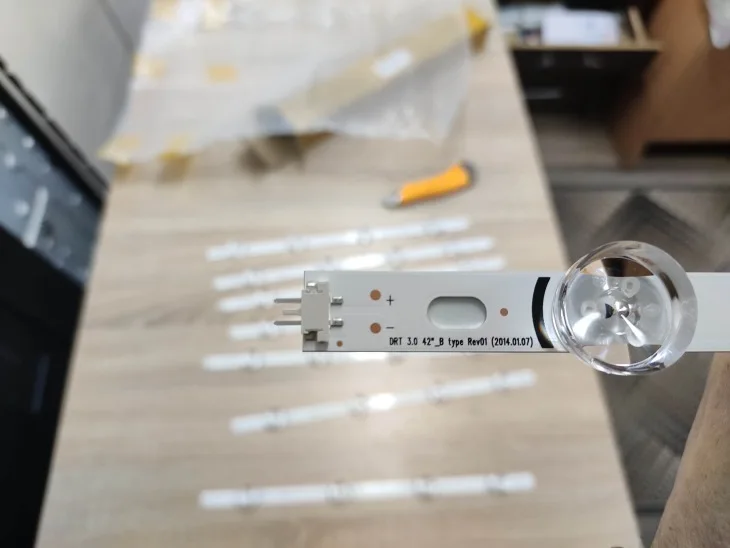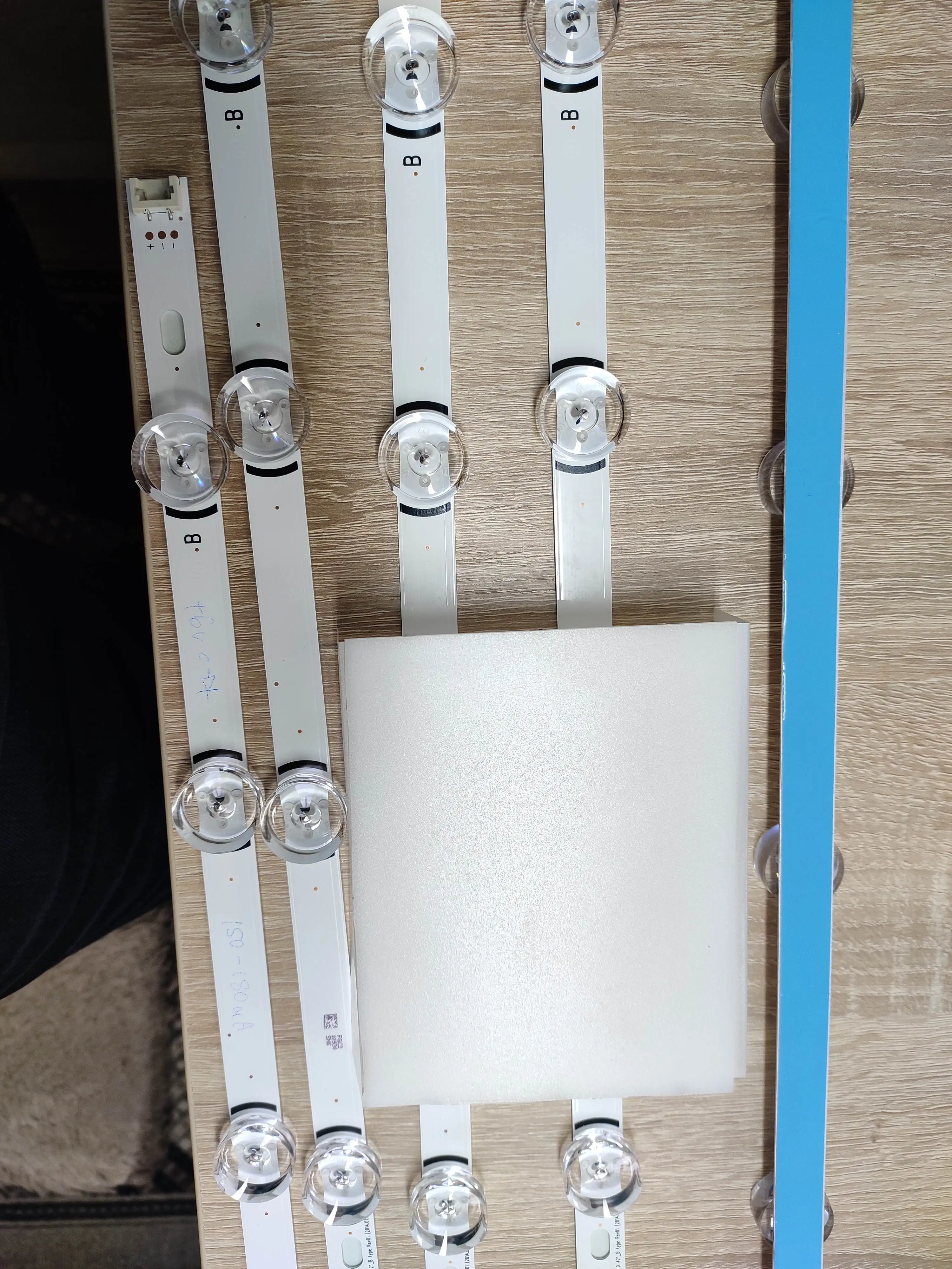 Заказ прибыл в течении недели. Посылка без повреждений ИМЛ. Был протестирован по всем показателям подсветки. Полосы на алюминии, с клейкой двусторонней лентой по всей поверхности полос. Имеют светодиоды +6в с компенсационным диодом внутри. Ток светодиода при стабильном +3,0в потребляют от 130 -180 мА. При установке в панель засветов не выявлено, поле равномерное без "яблок". Товар новый, повреждений не имеет. Рекомендую данный товар как лучшего качества и хорошей цены, соотвествует оригиналу, даже лучше.