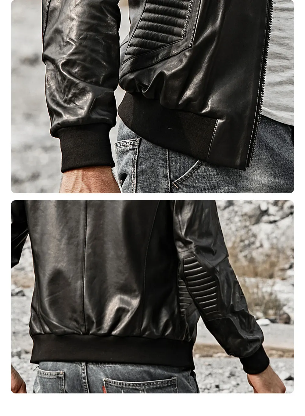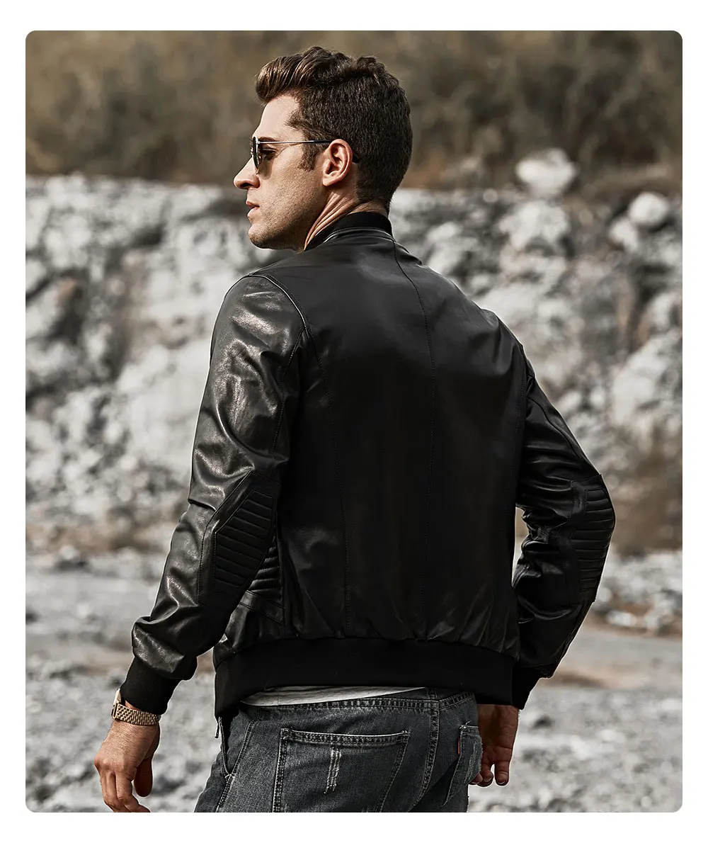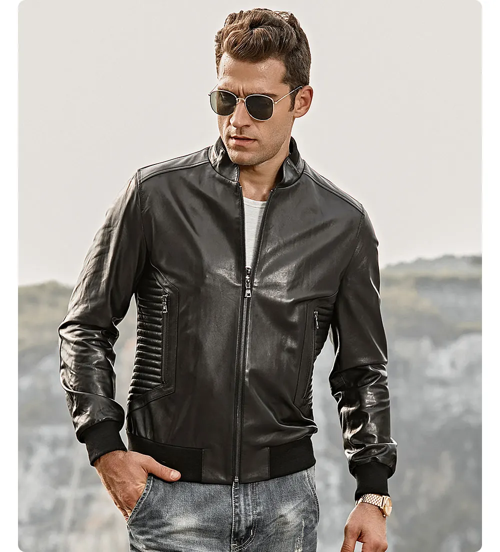 Мужская приталенная кожаная куртка FLAVOR, мотоциклетная куртка из шкуры ягненка, пальто из натуральной кожи со стоячим воротником и черными манжетами в рубчик