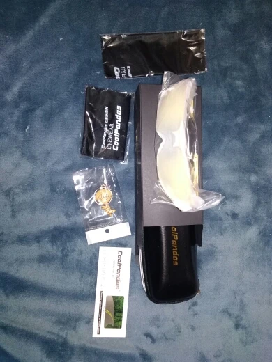Качество, прям удивило, очень не плохо, коробочка, чехол, 2 тряпочки, даже подарочек, тест картинка, да и сами очки немного тяжеленькие приятные душки, прорезиненые немного на конце. Пластик не поцарапан