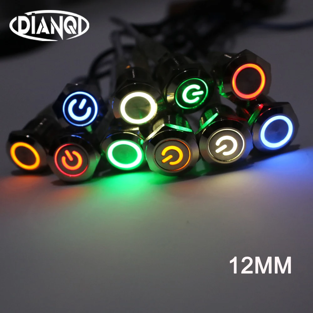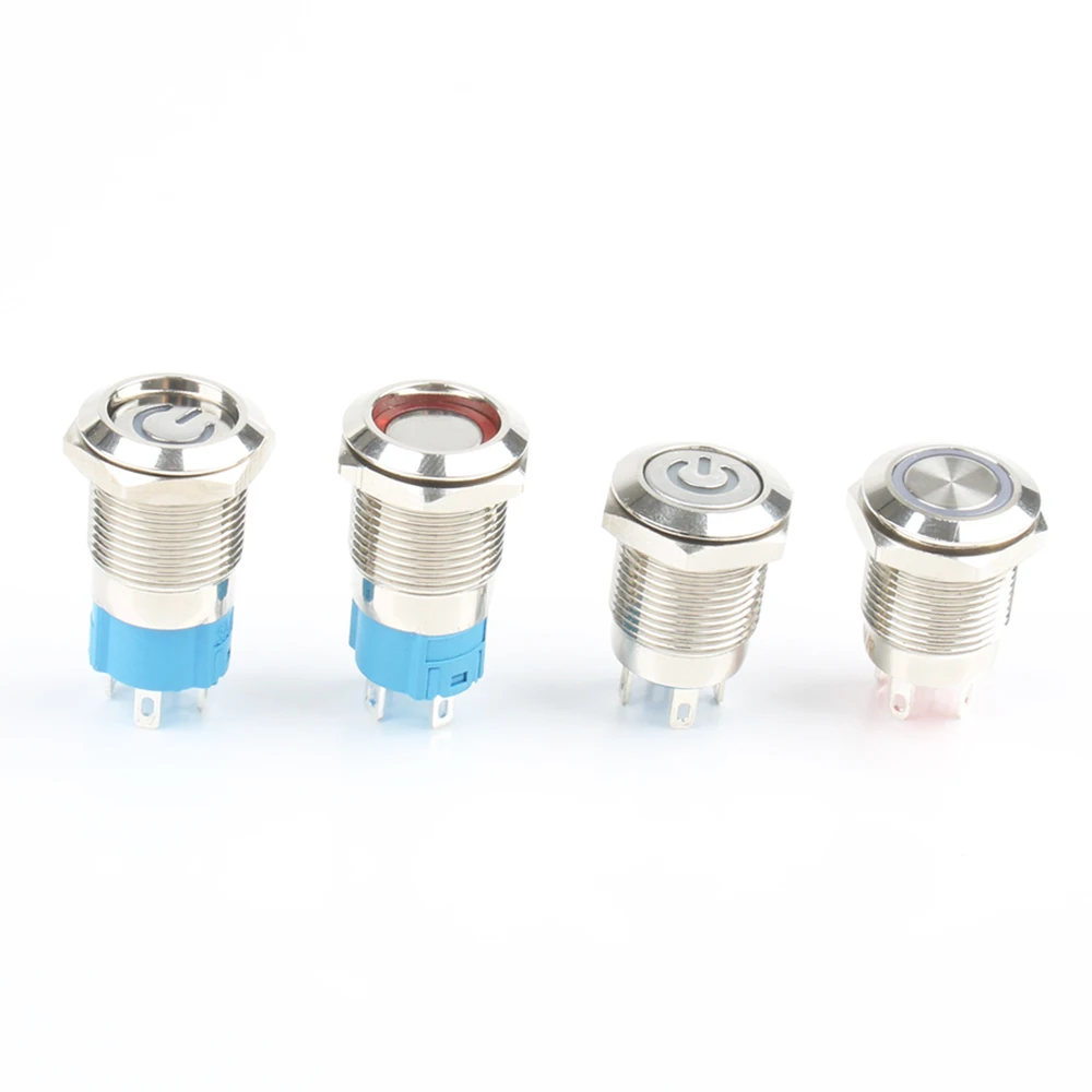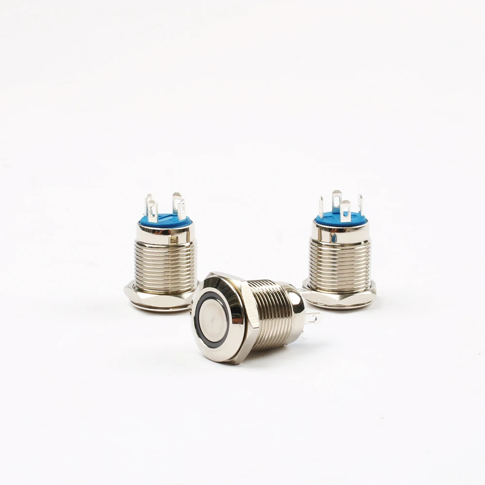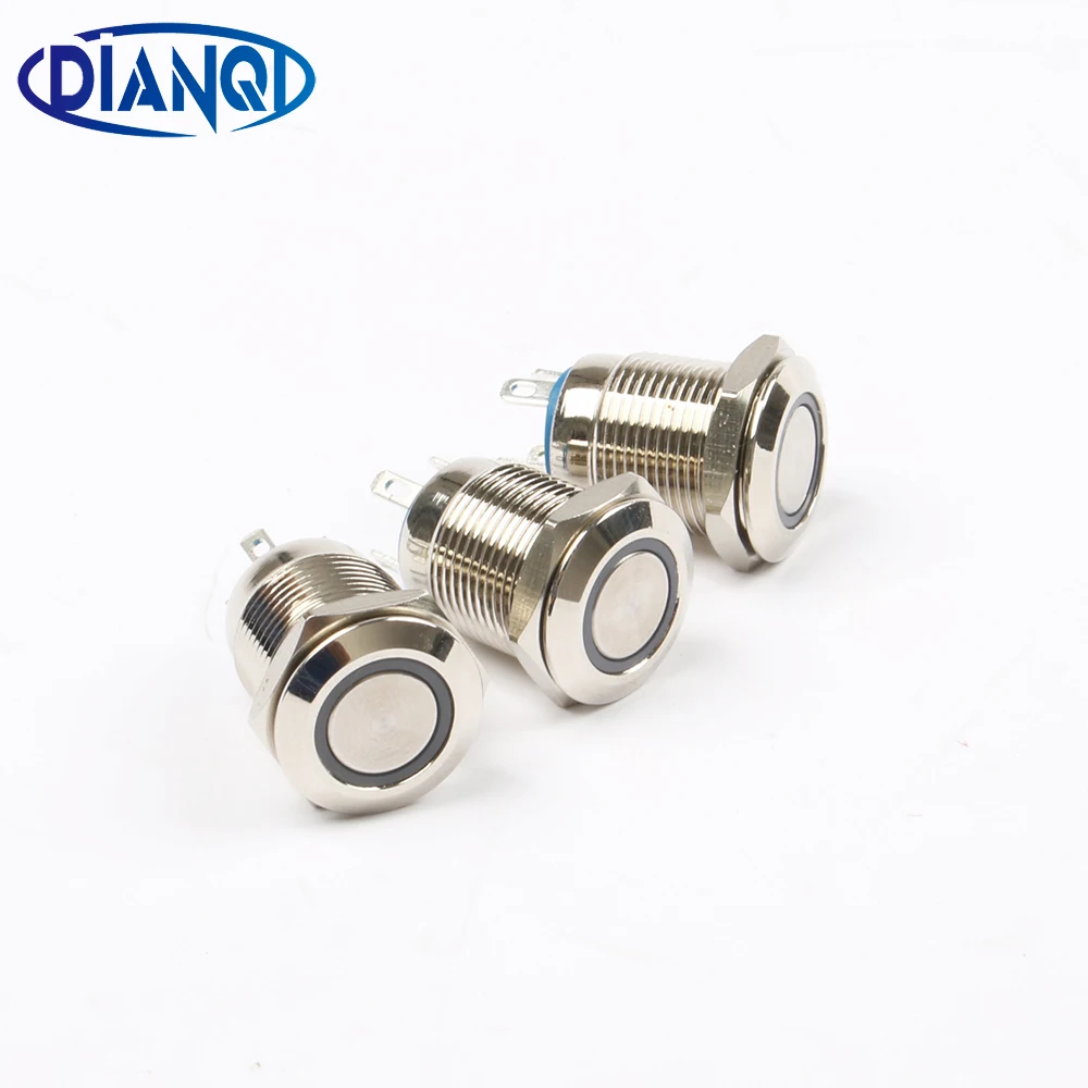Светодиодный ные металлические латунные кнопочные переключатели 12 мм, 1NO, мгновенные, красные, желтые, синие, белые, зеленые светодиодный светодиодные кольца 220 В, 12 В, 24 В, выключатели с фиксацией