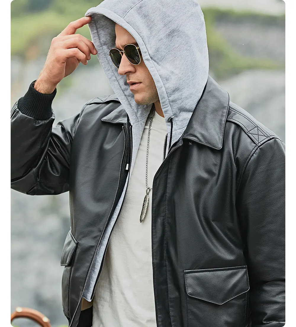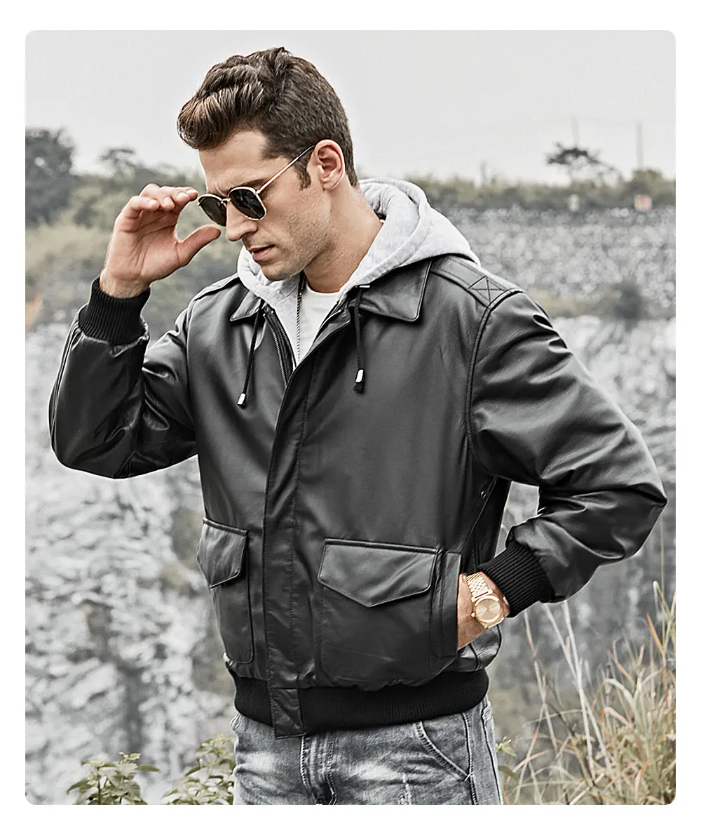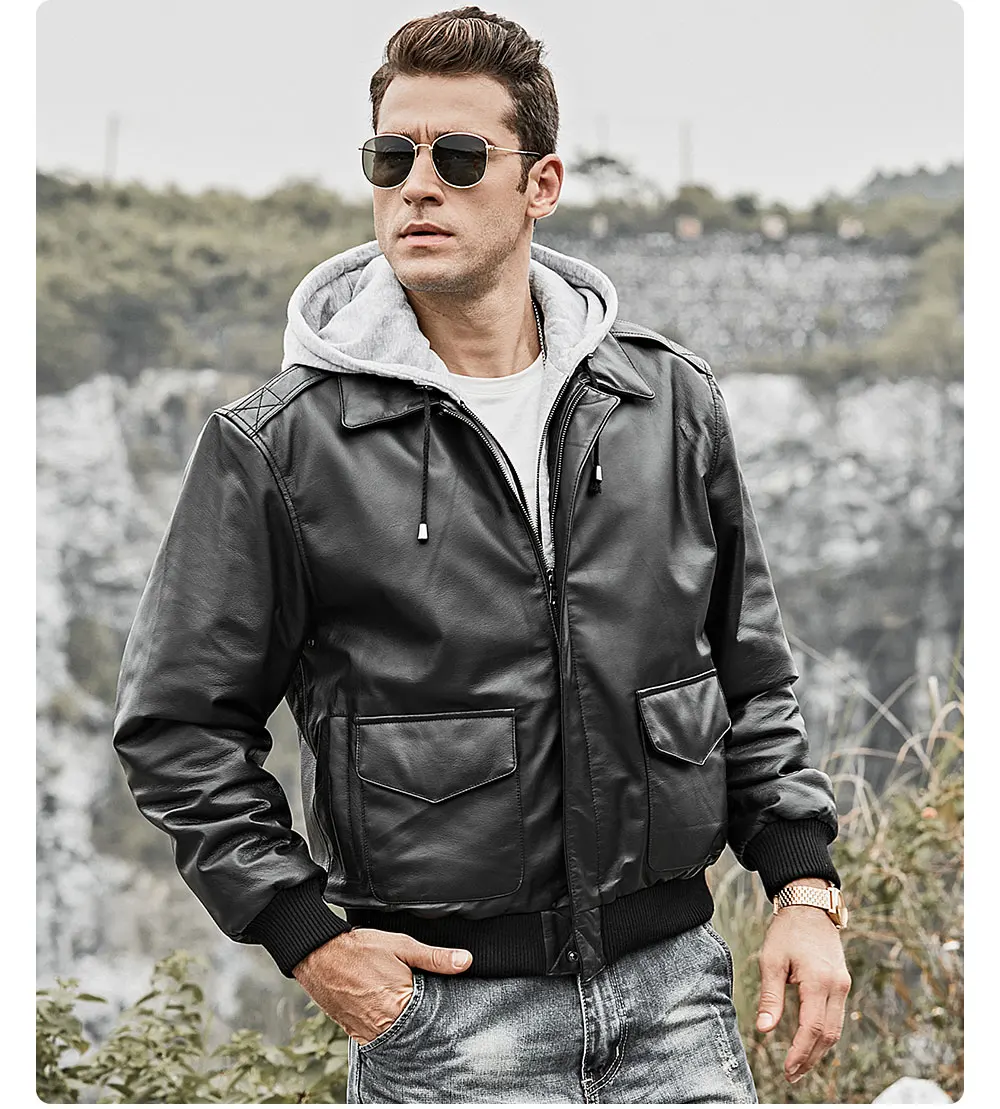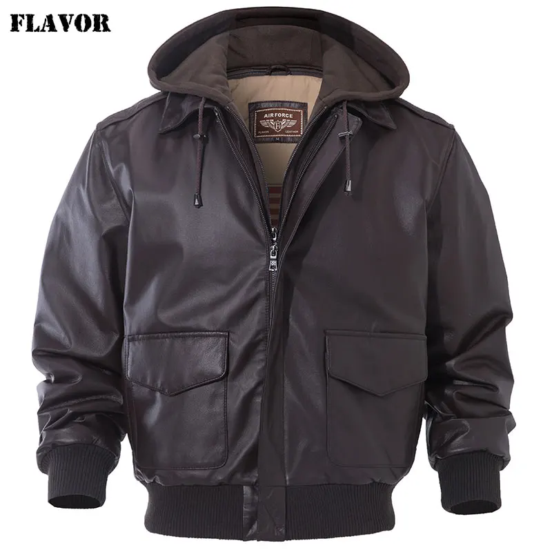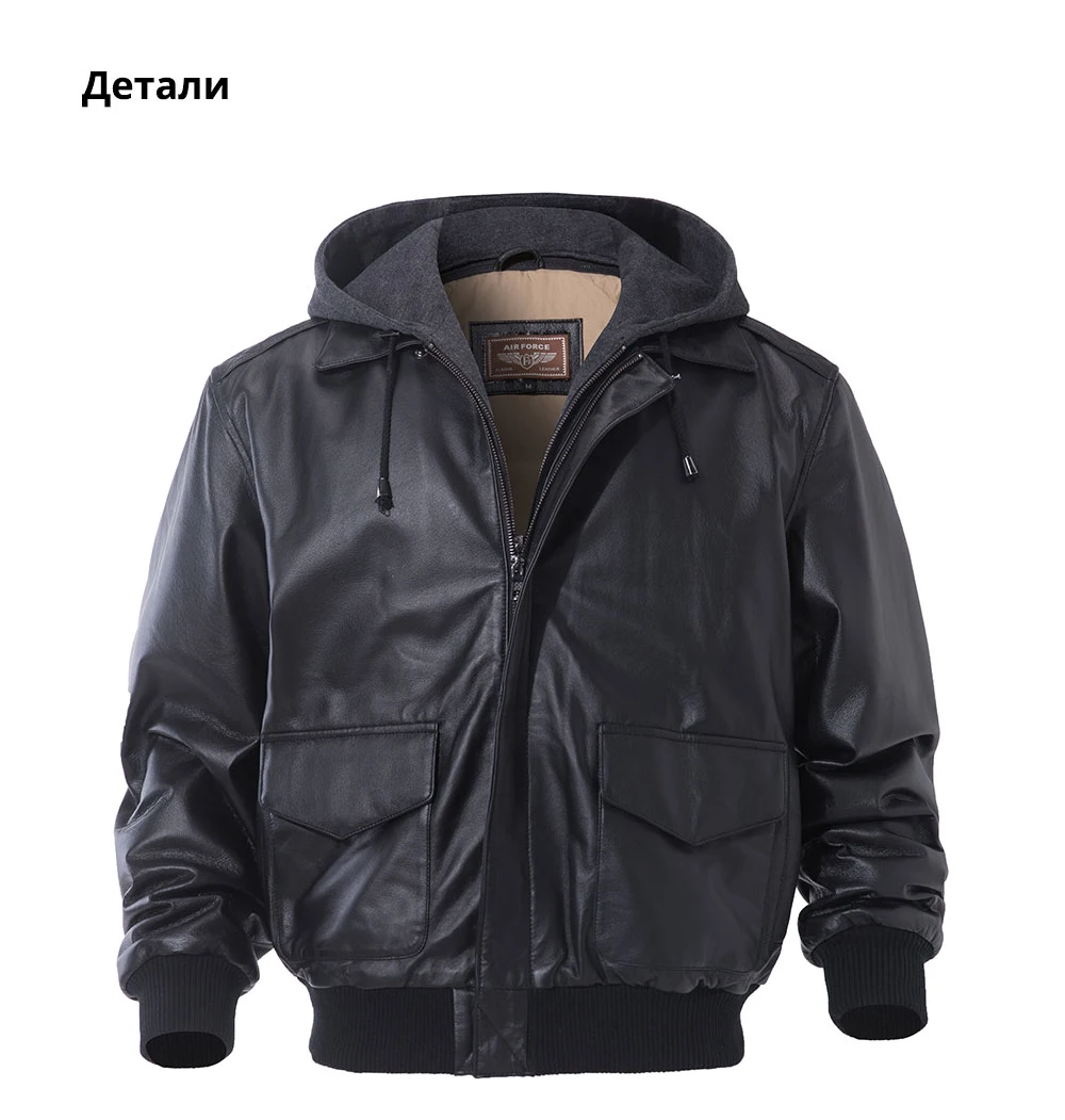 Kожаная куртка мужская бомбер FLAVOR, черный жакет из натуральной овечьей кожи со съемным капюшоном, теплая лётная куртка для мужчин на осень-зиму 2019