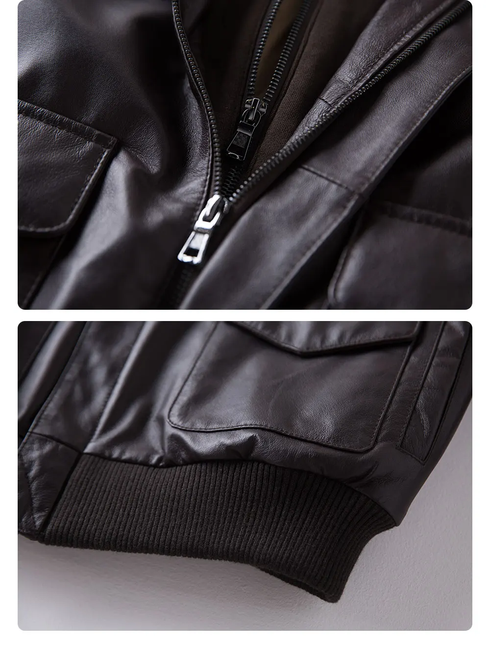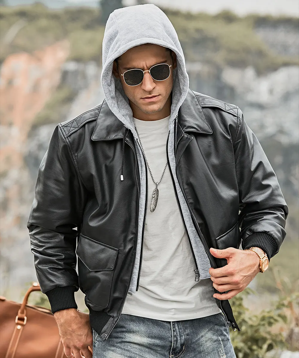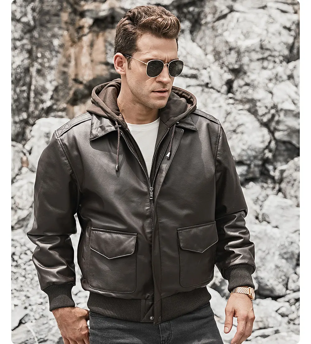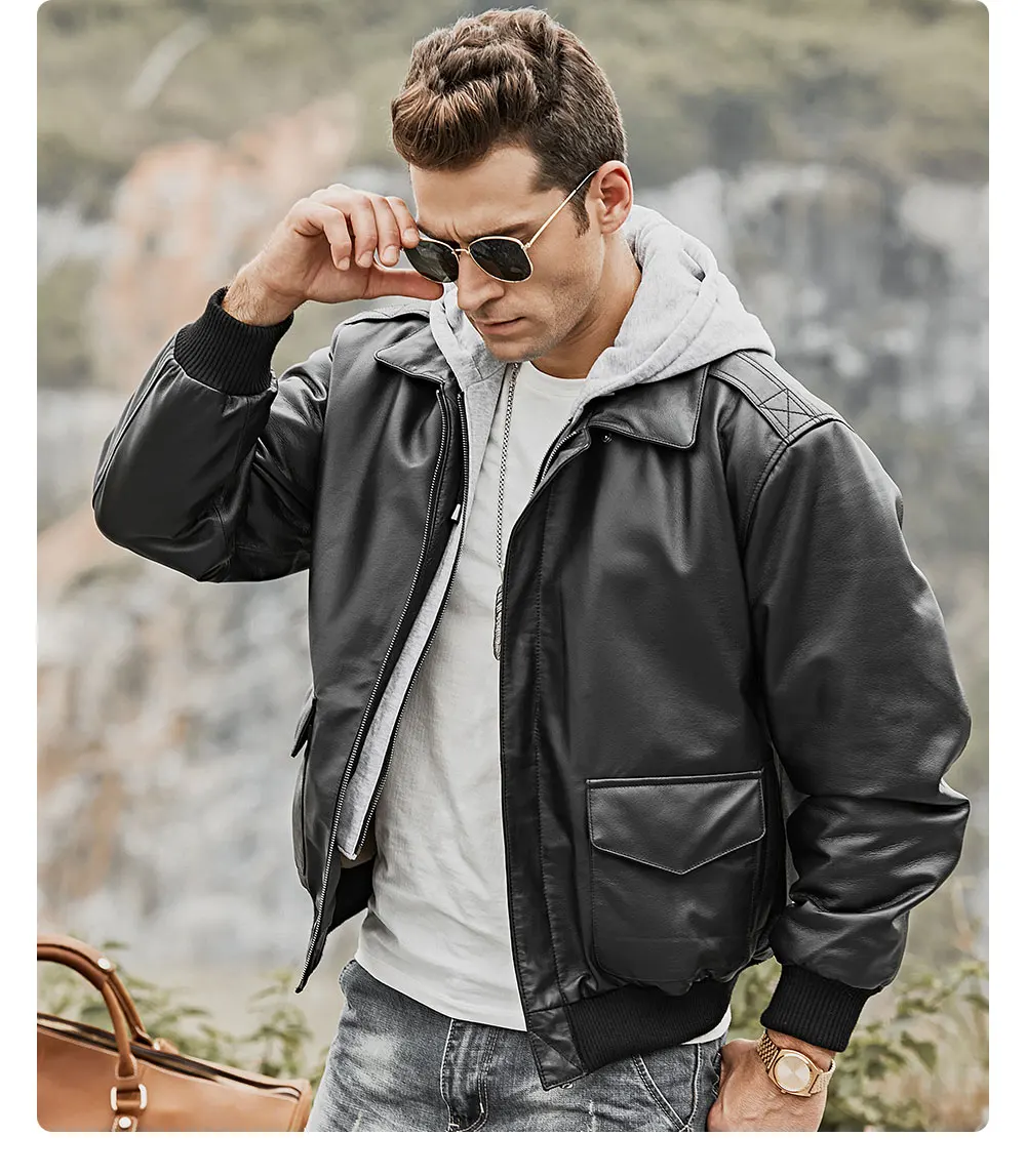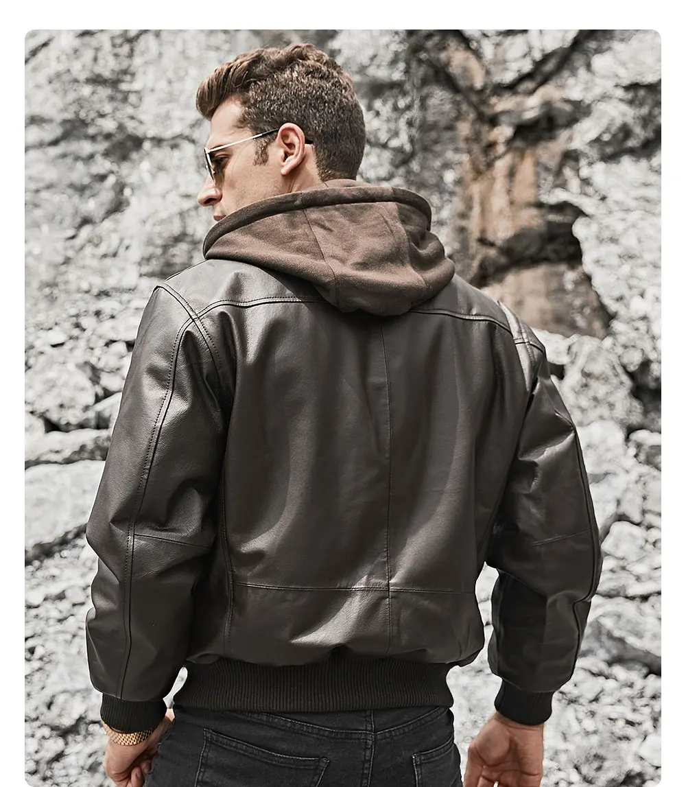 Kожаная куртка мужская бомбер FLAVOR, черный жакет из натуральной овечьей кожи со съемным капюшоном, теплая лётная куртка для мужчин на осень-зиму 2019