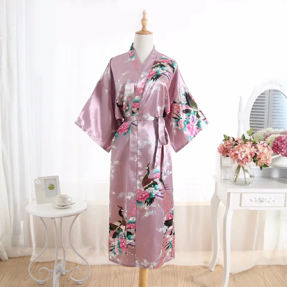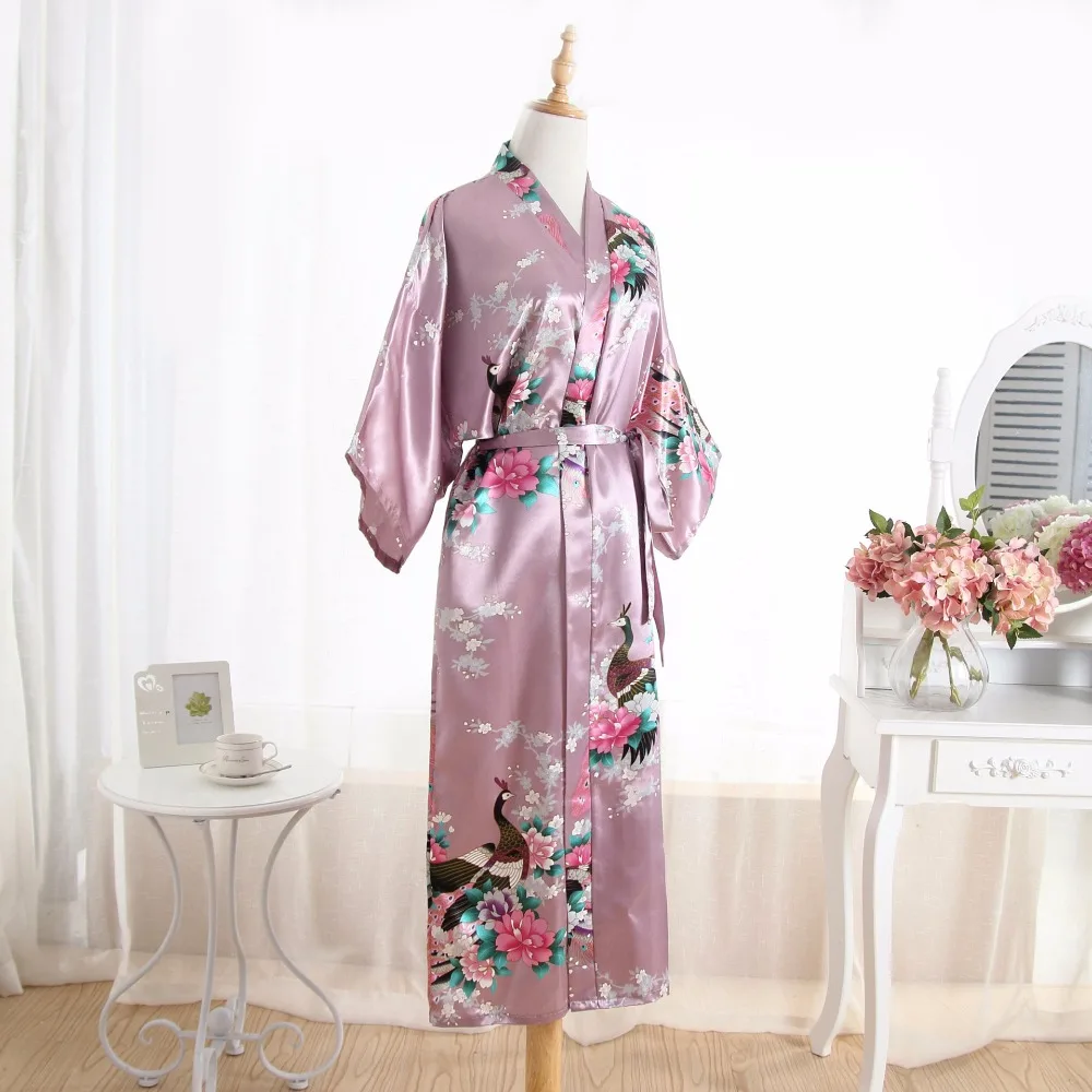 Женский Шелковый Атласный длинный банный халат невесты, кимоно с цветочным рисунком, большого размера