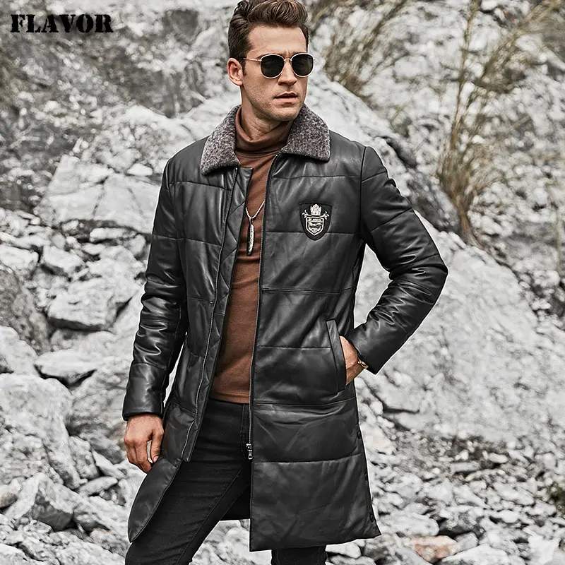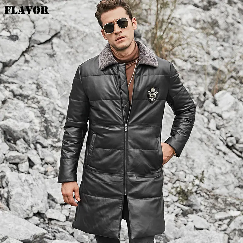 Kожаная куртка мужская теплый пуховик из настоящей кожи FLAVOR, кожаная куртка из натуральной шкуры ягненка, с отстегивющимся воротником из овечьей шерсти, для зимы
