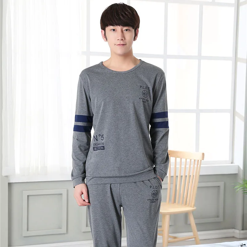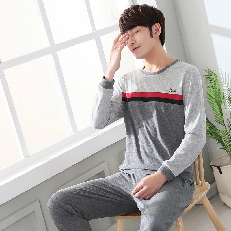 Домашняя одежда высокого качества с длинным рукавом, хлопковые Пижамные комплекты для мужчин, Осень-зима 2018, Повседневная полосатая Пижама с круглым вырезом, Мужская домашняя одежда