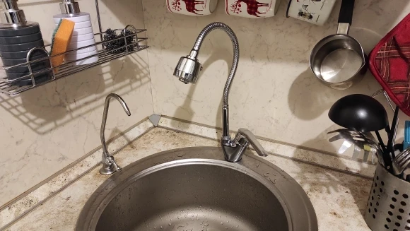 Кран хороший. Но очень маленькая резьба. Когда вставили в отверстие в столешницей, выяснилось, что изнутри его совсем не видно. То есть затянуть шланги не вышло. Лежит мёртвым грузом (