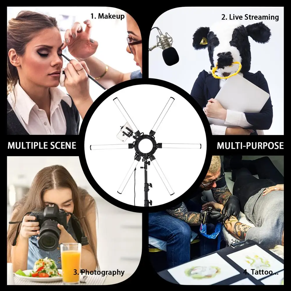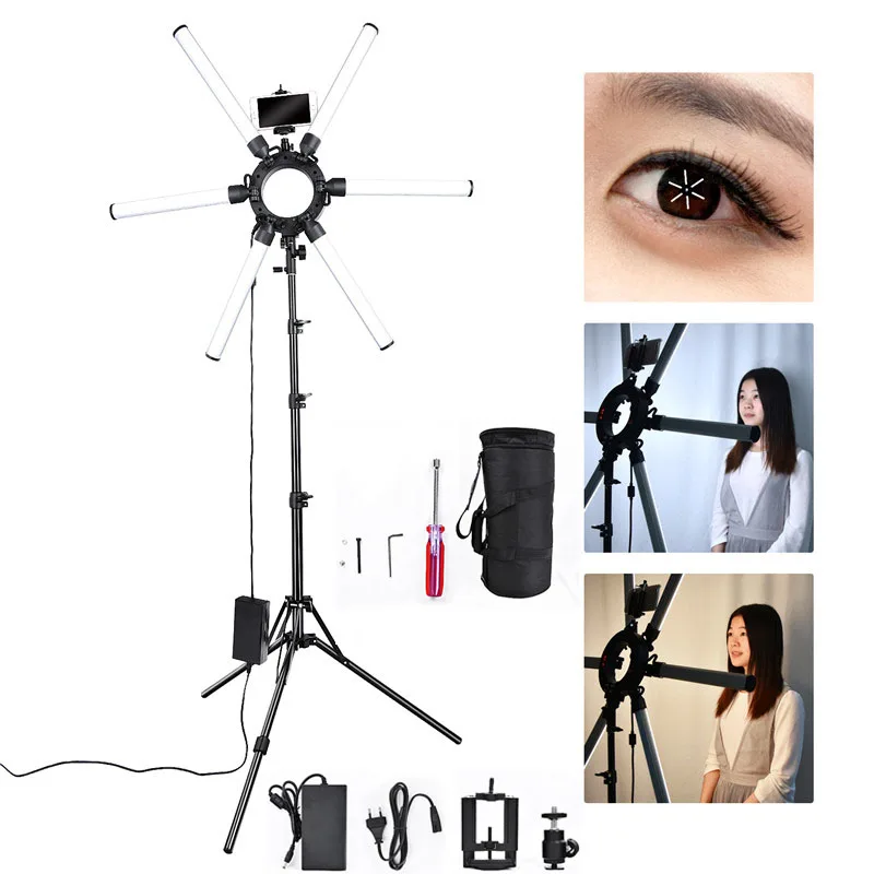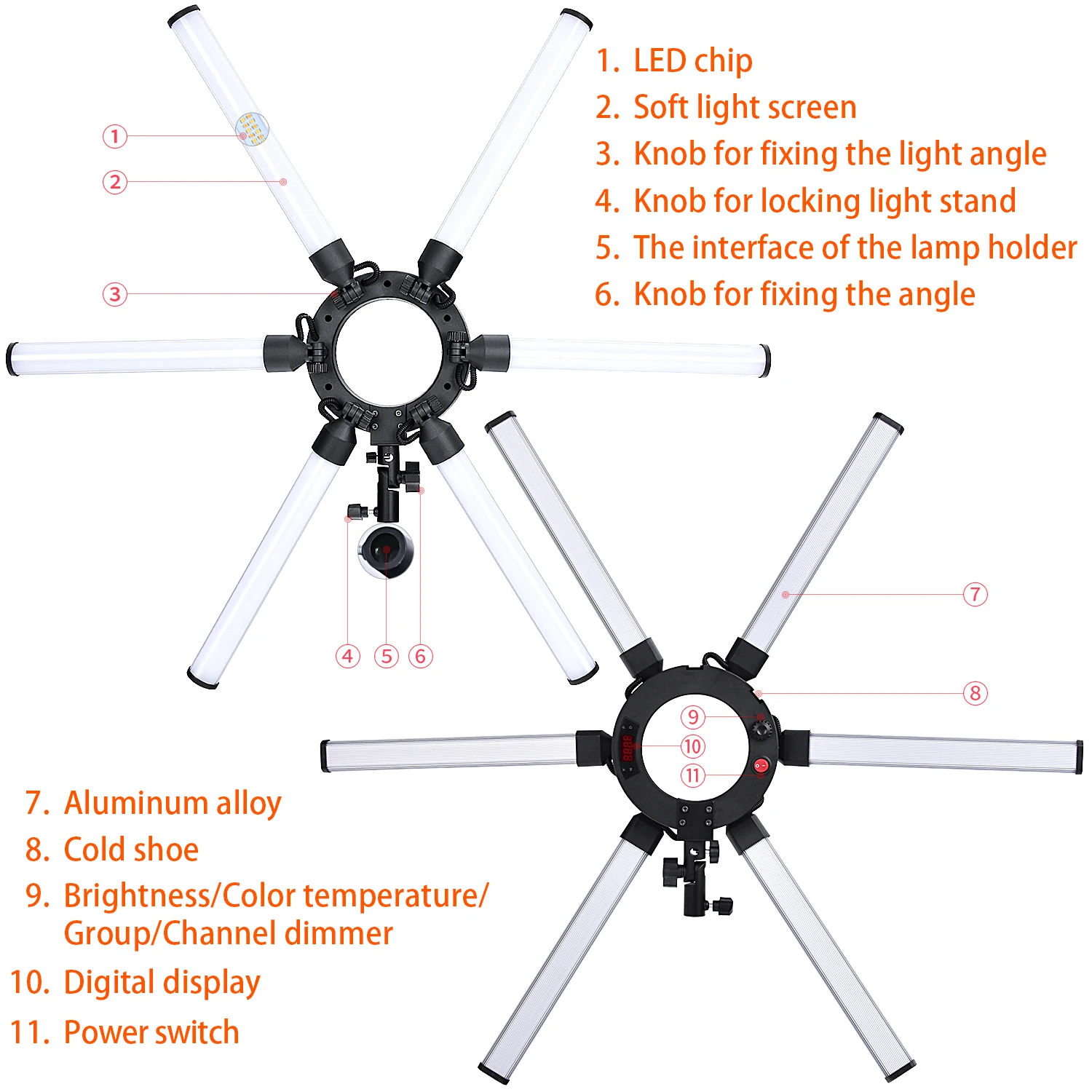 Световой поток: 12000lmИнструкция по эксплуатации(5,1) Возьмите легкий корпус из упаковки вставьте адаптер питания и подключите к переменному току(5,2) Включите свет, сигнал “P” W ”-это красный свет, и в функцию регулировки света, цифровая мощность (1) дисплей от 1,0 до 6,0(5,3) нажмите многофункциональную ручку (2) в режим DMX512, сигнал «D» идет красный свет, цифровой экран питания (1) отображает от d1 до d512 на выбор.(5,4) нажмите на ручку (2) в режим цветовой температуры и сигнал “K”-это свет, цифровой экран (1) дисплей 3200k,4200k и 5600k.(5,5) поместите камеру на фиксирующий винт (4), он может регулировать положение камеры, передней или задней.(5,6) Отрегулируйте винт (5) . Он может регулировать высоту камерыПосылка включает в себя:1 * звездный свет1 * сумка1 * держатель для мобильного телефона1 * шаровой головкой1 * Адаптер питания1 * штекер (США, ЕС, Великобритания, Австралия, пожалуйста, сообщите нам, что вы хотите)1 * Руководство пользователя1 * штатив-ТриподЯ буду звездой в ваших глаза, вы будете самой яркой звездой в мире, 3200-5600K, различные формы с различными световыми эффектамиПожалуйста, обратите внимание: у нас есть два типа держателей для телефонов, мы можем отправить вас случайным образом. Спасибо