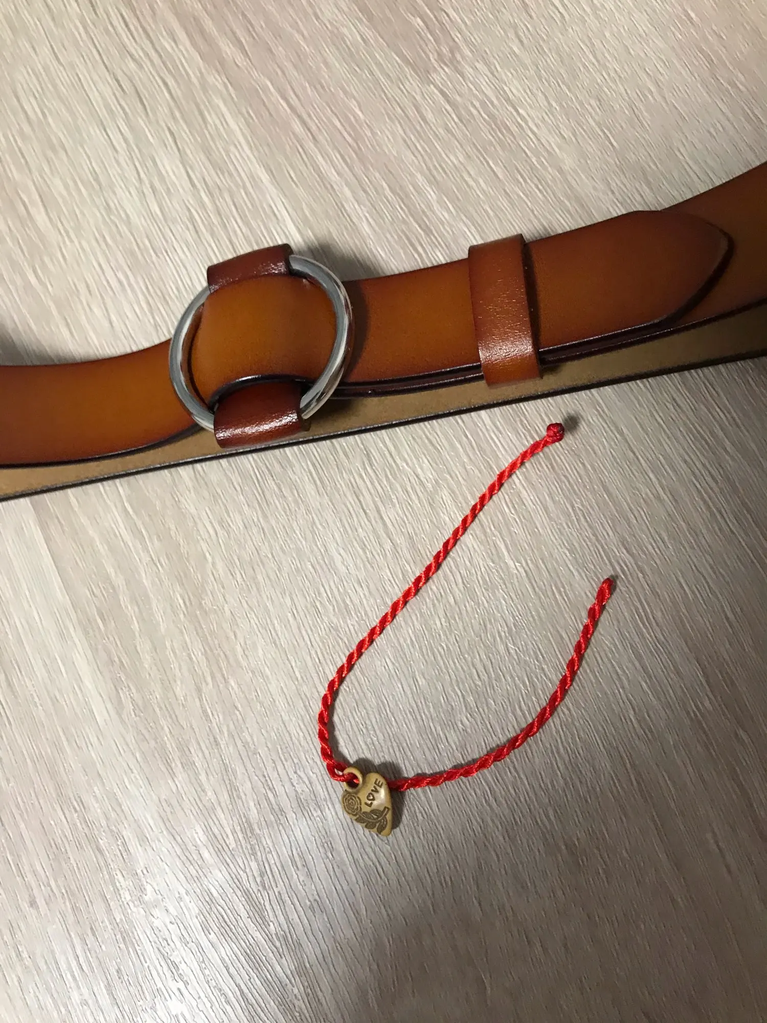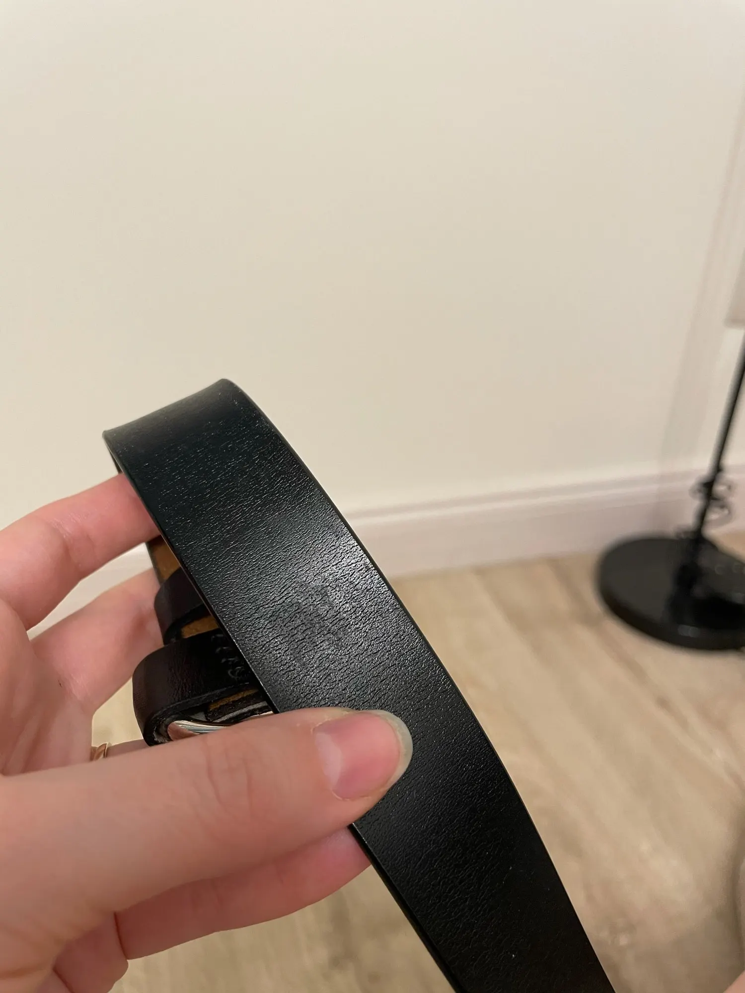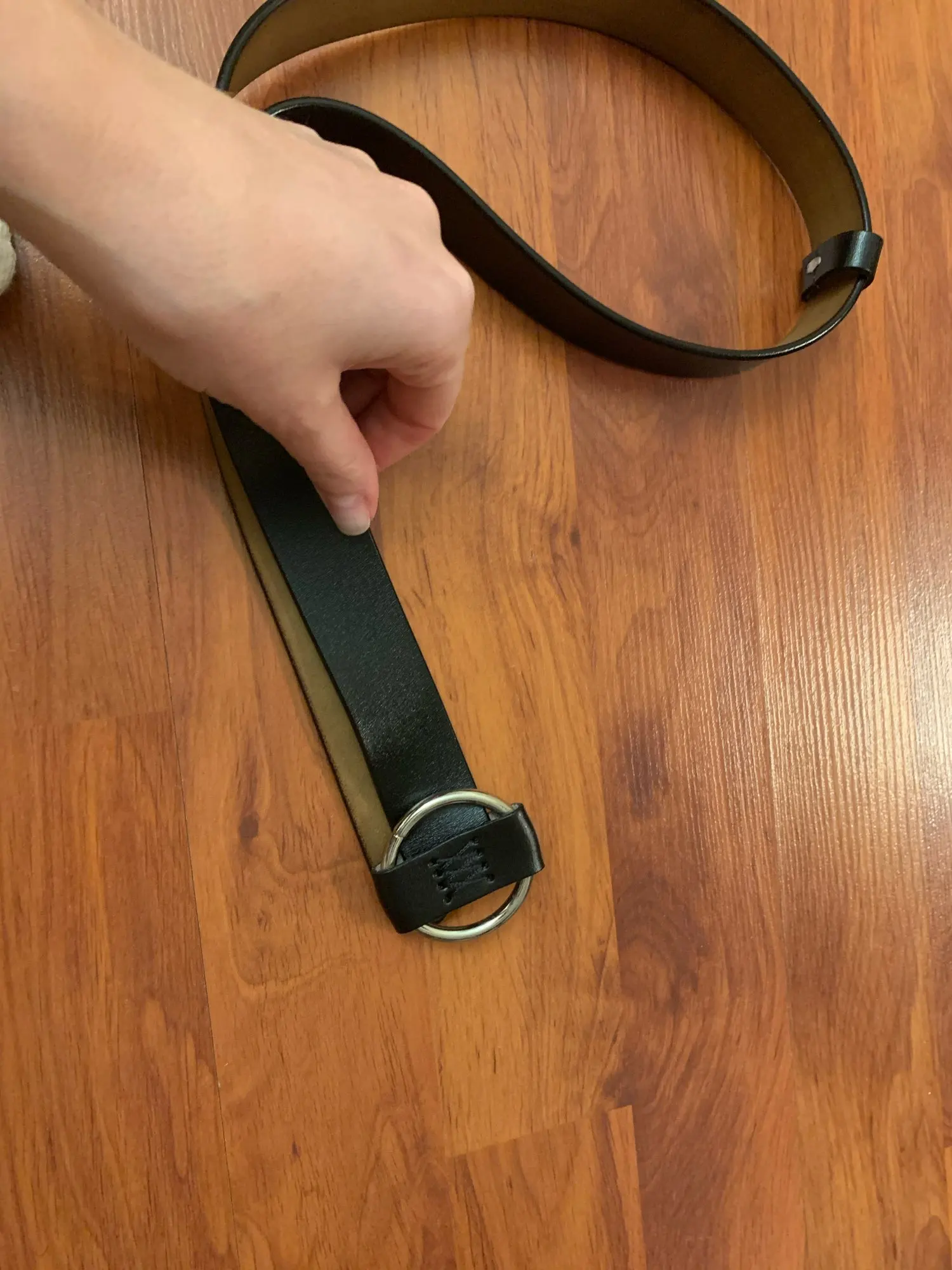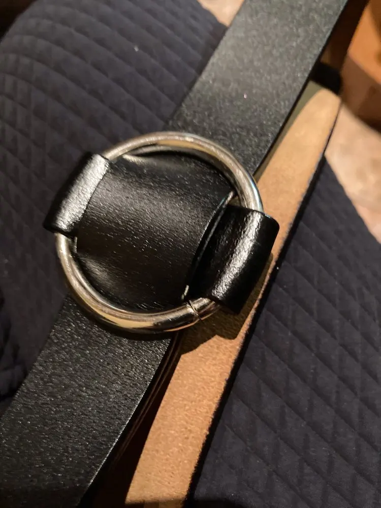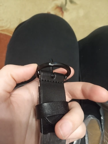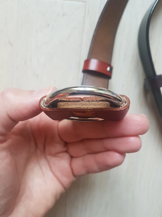 Ремень неплохой, но есть небольшие потертости ( на фото). В принципе они будут прикрыты, но не приятно. Есть дефект в металлическом кольце-разъём не спрятали за кожу с боков, а когда начинаешь его сдвигать в сторону боковых петелек, то вылезает неотполированная часть кольца с какими то шероховатостями