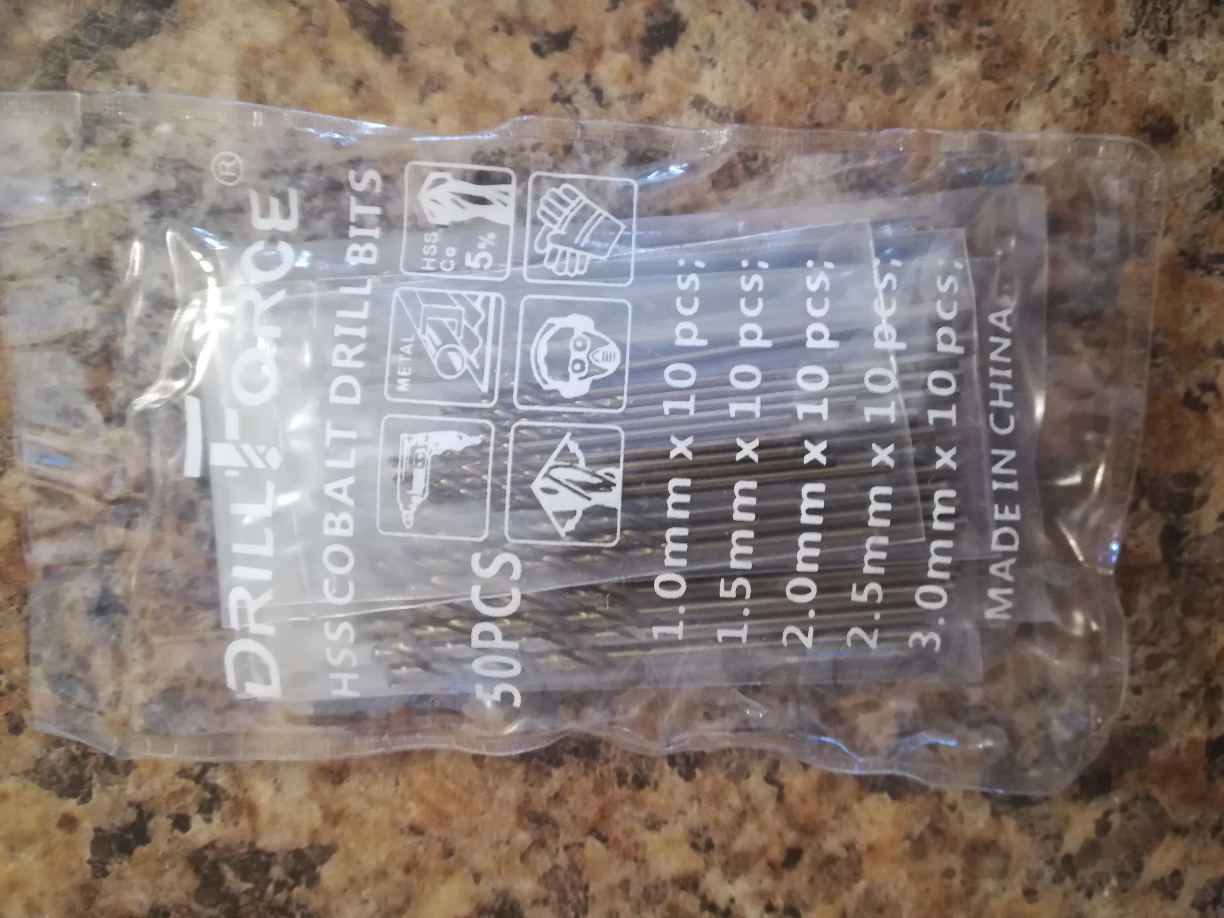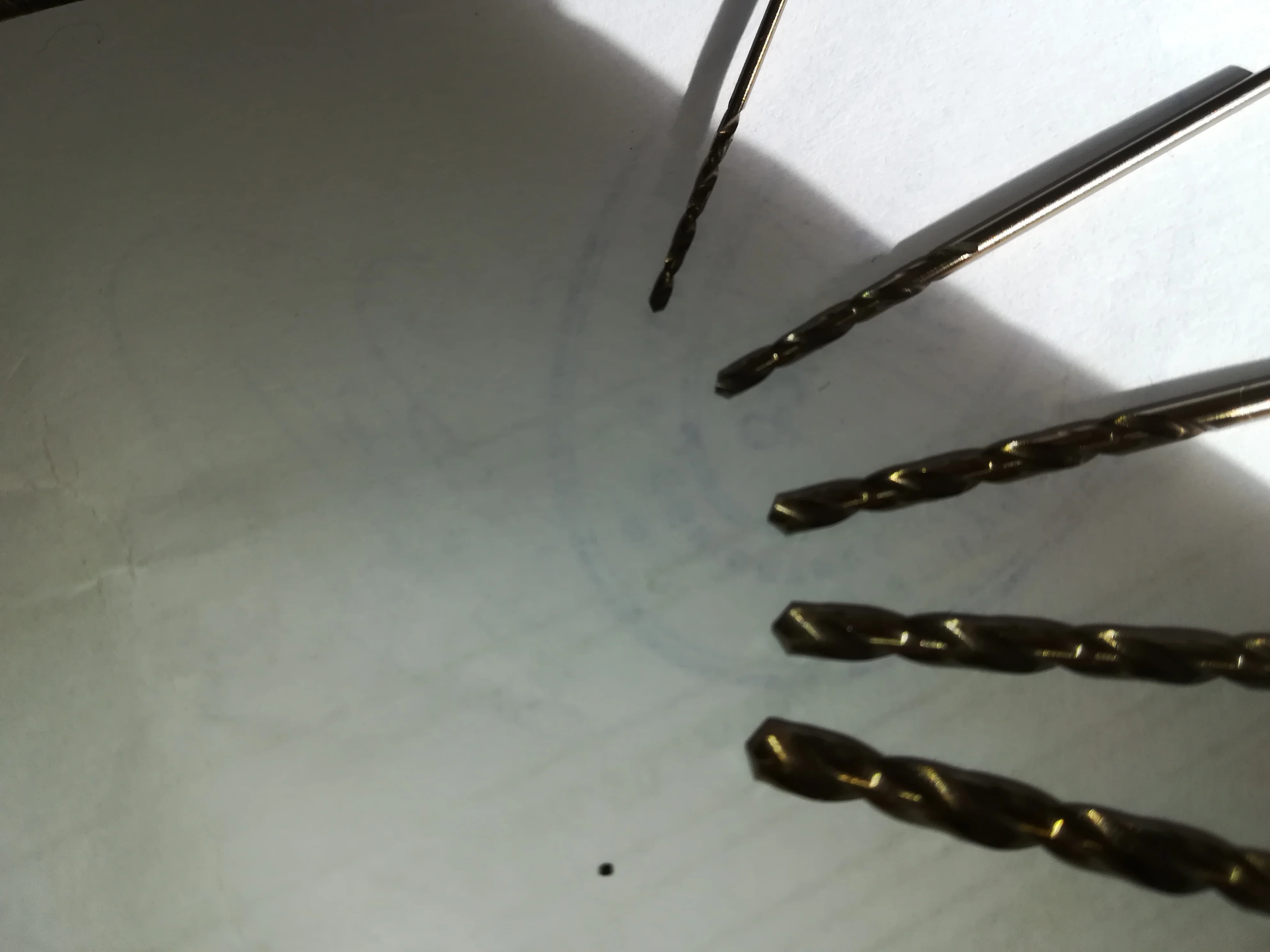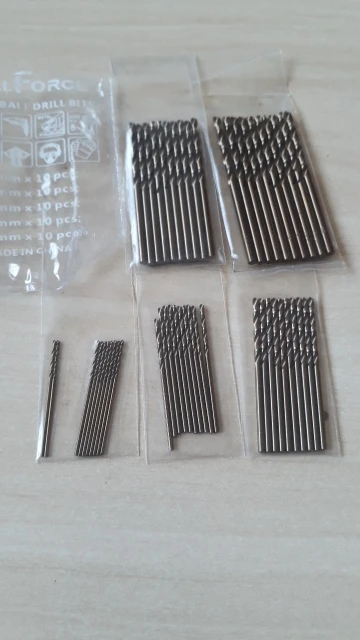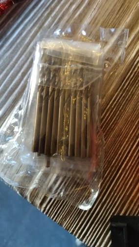 Товар в Беларусь пришел менее, чем за месяц. Сверла были упакованы в свои пакетики по размеру и в один общий пакетик с маркировкой магазина и содержимого. Количество соответствует заявленному. Угол заточки на фото, на 3 мм больше, чем на остальных. Маркировка диаметра только на 3 мм. Напильник (надфиль) скользит, после наждака цвет соответствует сверлу HSS-Co, купленному в магазине (на фтото). Диаметр в каждом размере гуляет не более 0,05 мм, на 3 мм пластмассовый штангель показал 2,9 мм. В целом покупка без скидки на цену хорошая. Пока не сверлил.