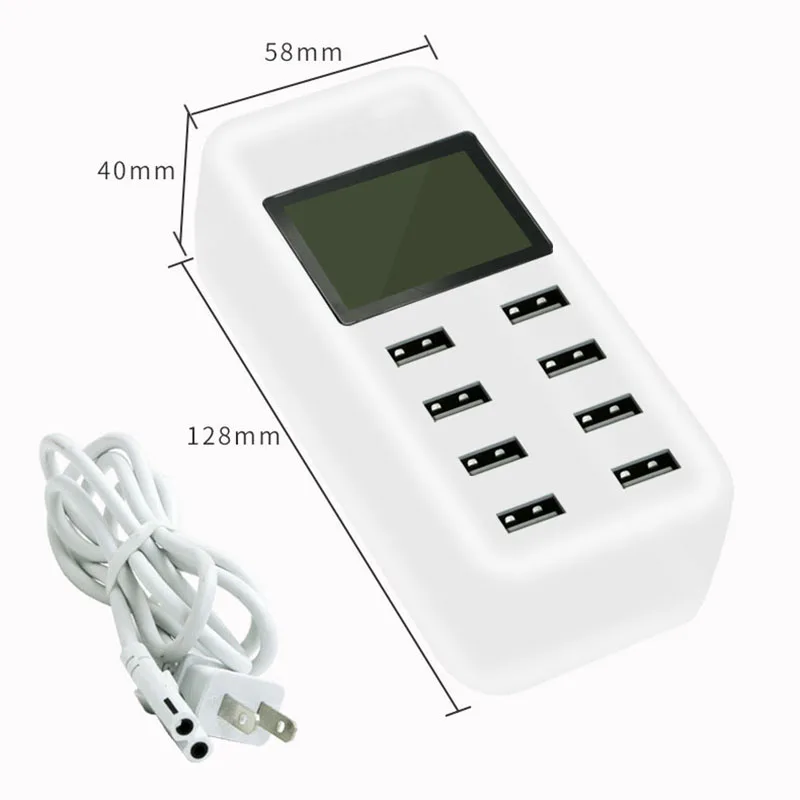 Смарт USB зарядное устройство с ЖК-дисплеем с 8 usb-портами питания для Мобильный телефон и планшеты Описание товара Технические характеристикиВход: 100-240 В ~ 50-60 Гц 0.8AНапряжение на выходе USB: 5V ~ 3.5A Общая мощность: 5 В ~ 8 А (макс.) Умное зарядное устройство USB с ЖК-дисплеемLCD ток, напряжение, мощность Цифровой точный дисплей;Поддерживает различные протоколы зарядки USB, каждый протокол зарядки автоматическое переключение:Защита от короткого замыкания на выходе;Защита от перегрузки по току;Защита от перегрева;Защита от перенапряжения;Защита от молнии. Внимание: Только для использования в помещении.Избегайте удара электрическим током, который подходит только для использования в сухой и водонепроницаемой среде.Не нажимайте на свинец или не подключайте к розетке.Не разбирайте и Не стучите зарядное устройство.Прекратите использовать зарядное устройство при покрытии или повреждении свинца. Посылка включает: 1x8 портов Смарт USB зарядное устройство