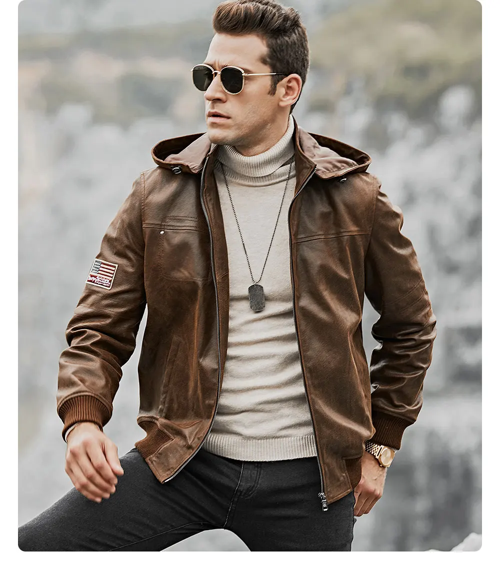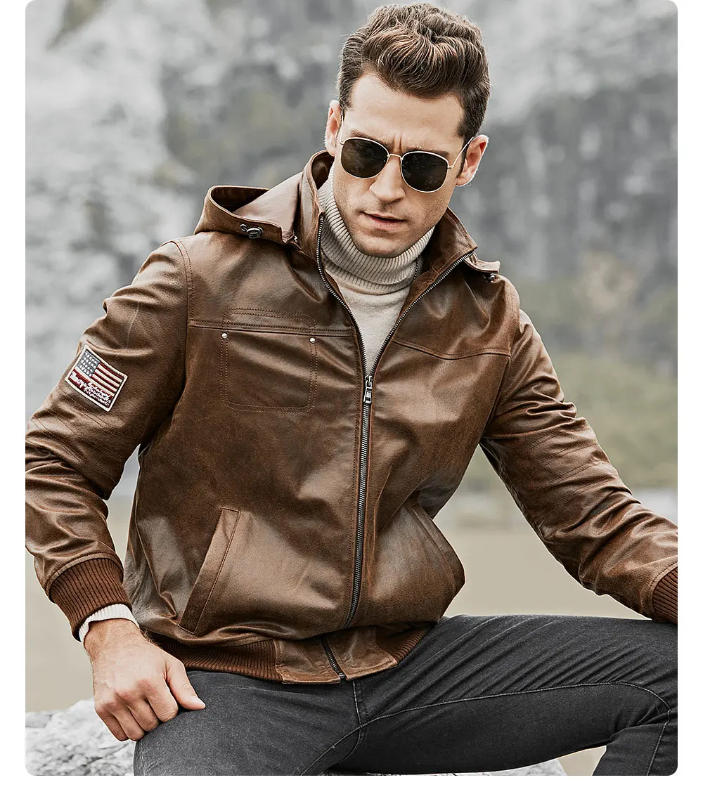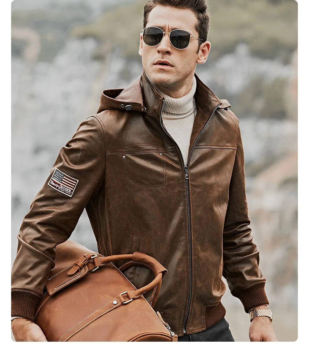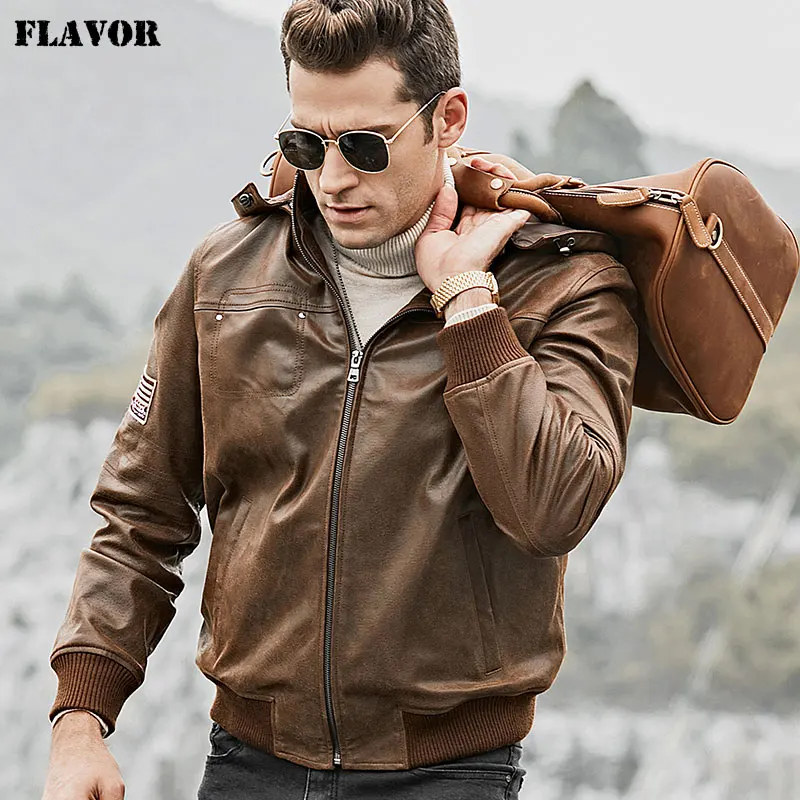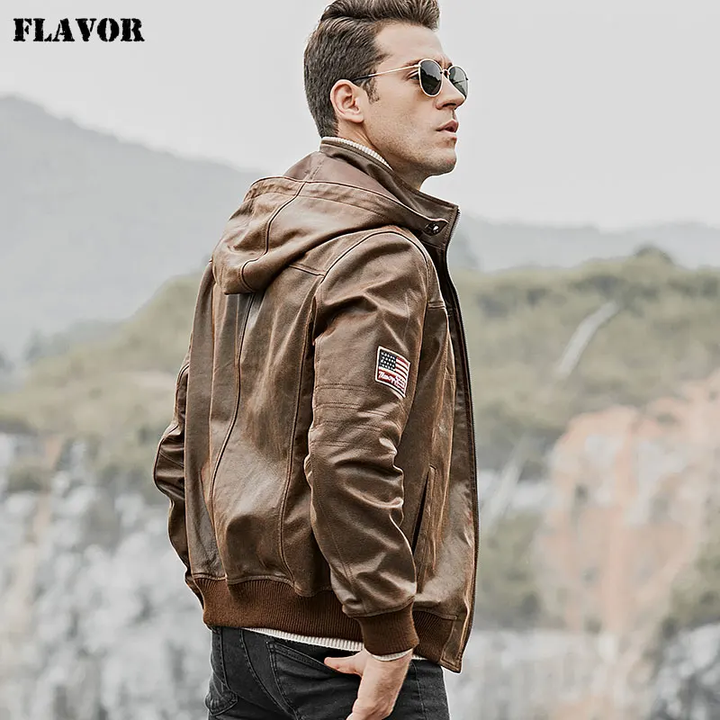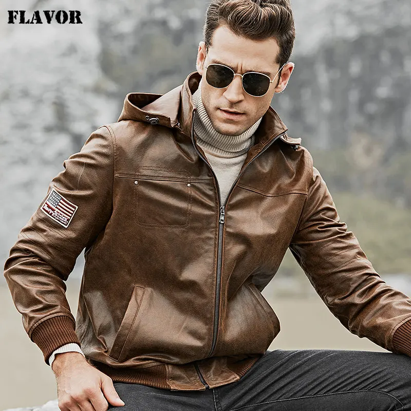 Kожаная куртка мужская пальто из свиной шкуры FLAVOR, мотоциклетная куртка из натуральной кожи с отстегивющимся капюшоном