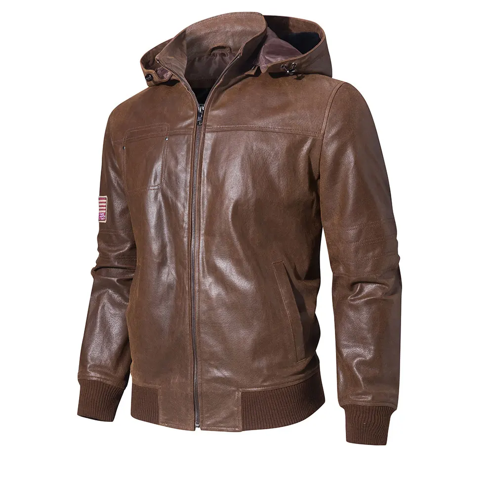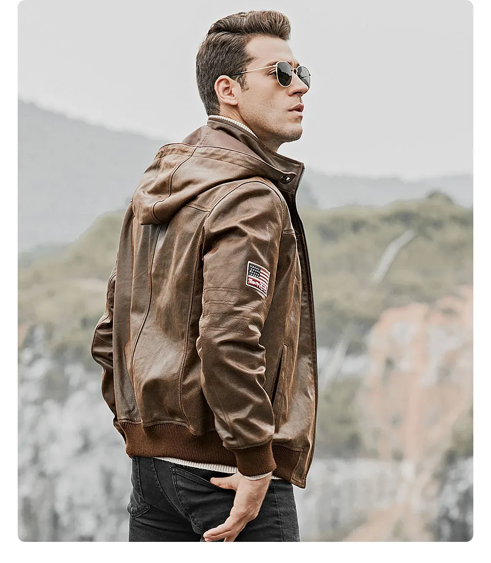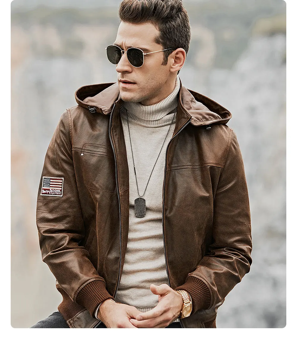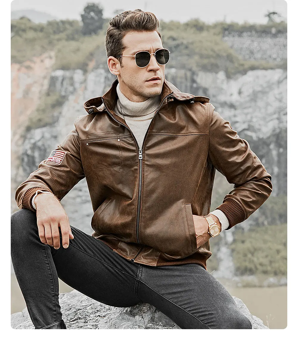 Kожаная куртка мужская пальто из свиной шкуры FLAVOR, мотоциклетная куртка из натуральной кожи с отстегивющимся капюшоном