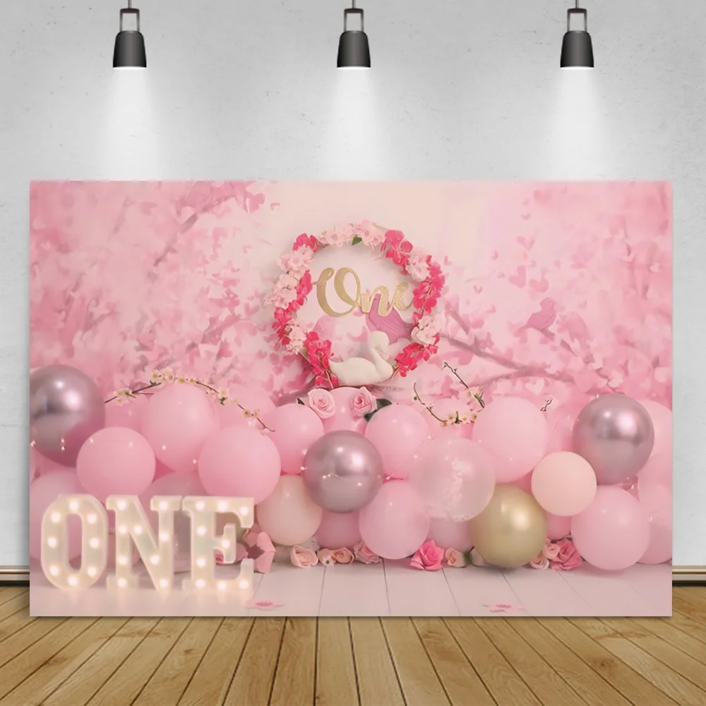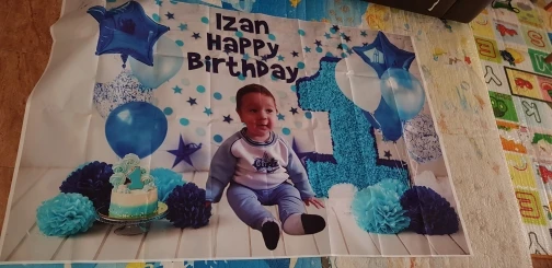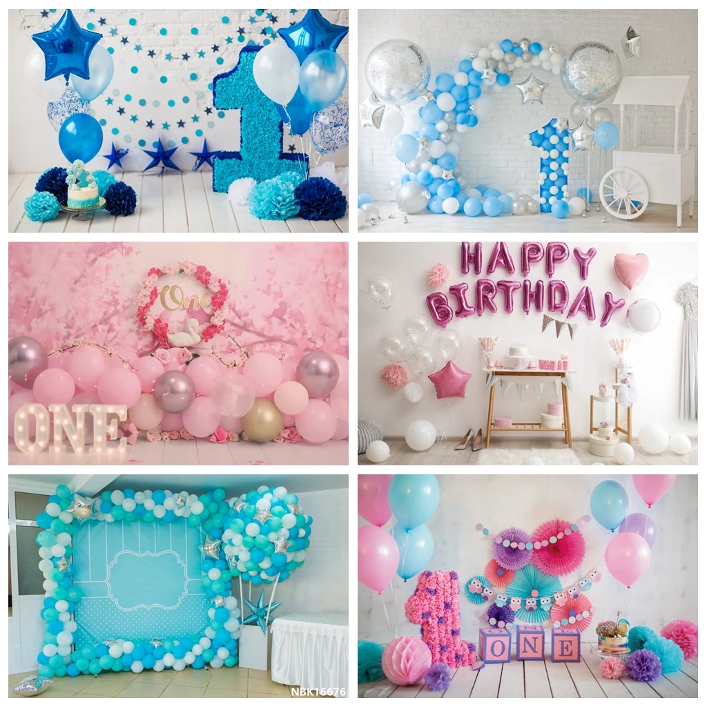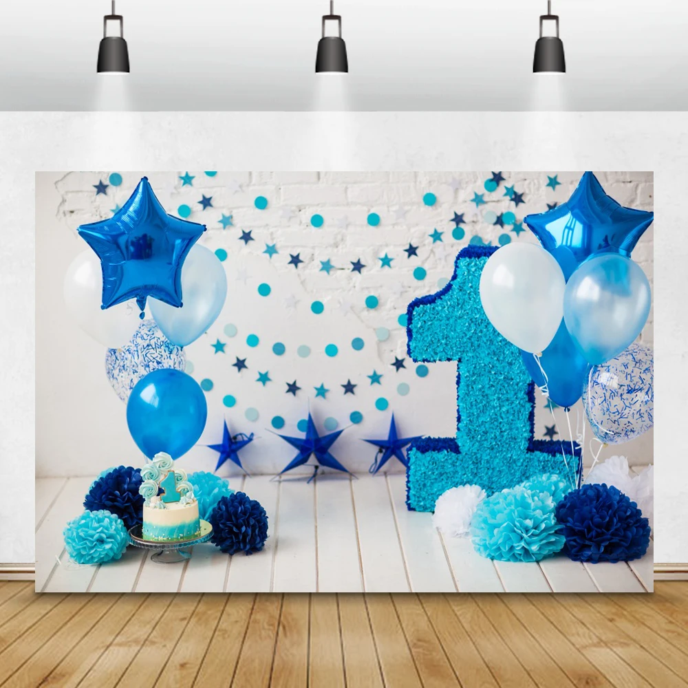Фон для фотографий Laeacco, день рождения, голубые воздушные шары, цветы, звезды, торт