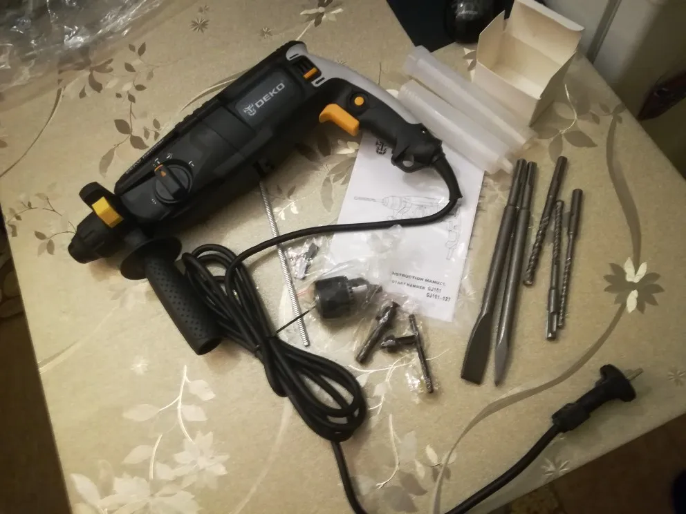 Перфоратор отличный! Посылку доставили быстро! Для дома то что надо, за такие деньги! Попробовал просверлить бетонную плиту в потолке, справился на ура! До этого пользовался фирмой Хитачи, и по сравнению ,Деко держится не плохо! Не смотря на хлипкий ящик и одноразовые сверла))) ставлю 8 балов из 10! Спасибо продавцу, и рекомендую!