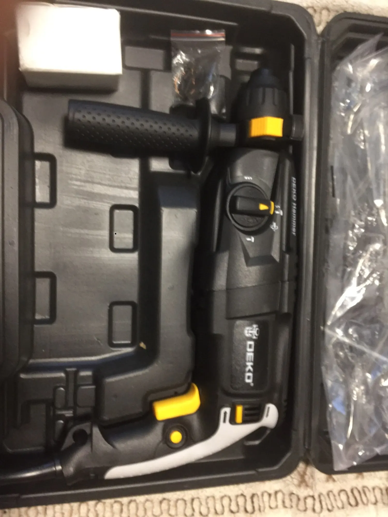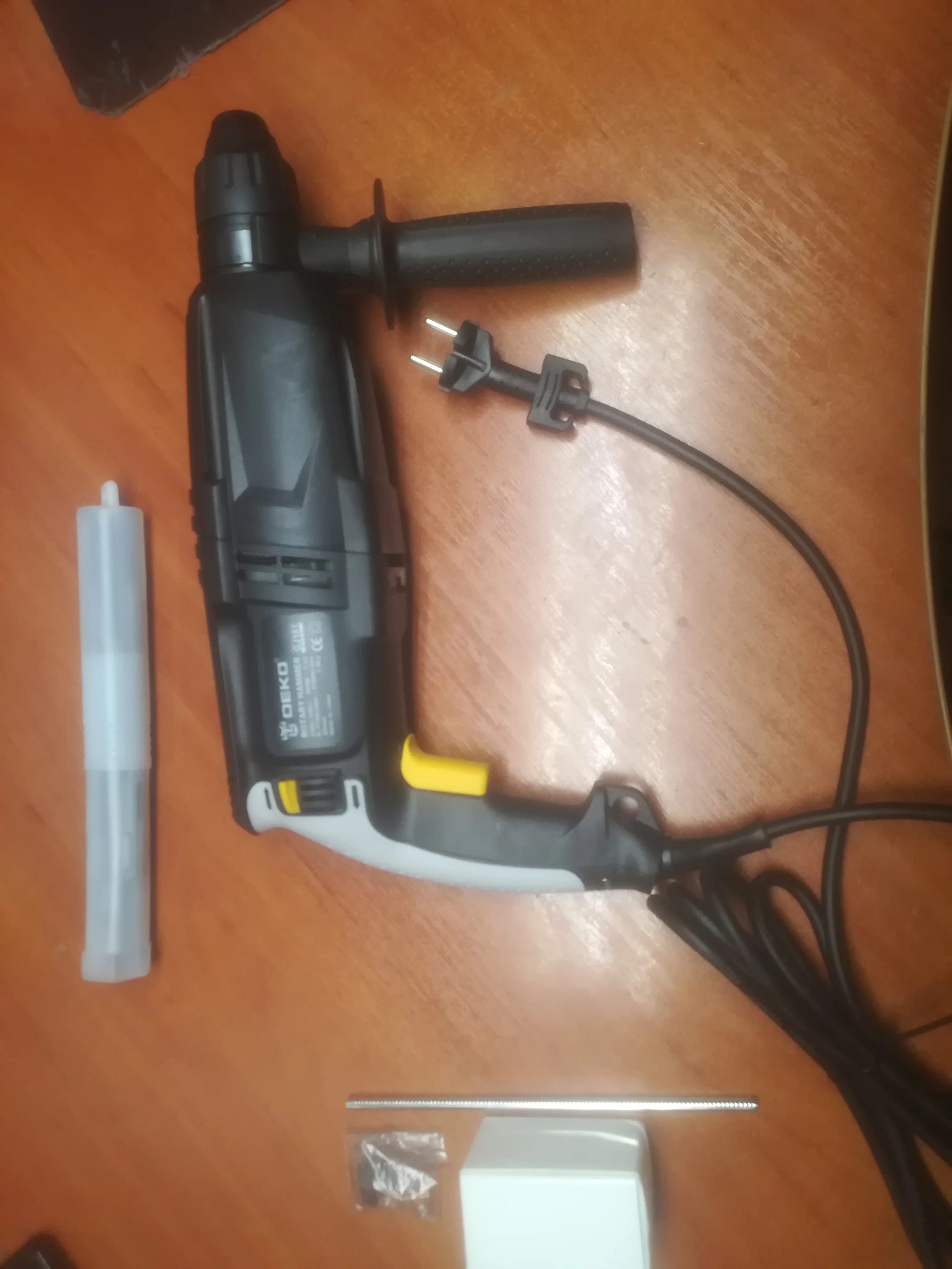 Дрель прибыла относительно быстро. Он поставляется с тремя сверлами, двумя точками и преобразователем в обычные биты. Сверло поддерживает три режима-только молоток, молоток с вращением, только для сверления и сверления. Все поставляется в пластиковом корпусе, который не слишком прочный, и защелки не блокируются должным образом. Штепсельная вилка имеет два контакта, без заземления.