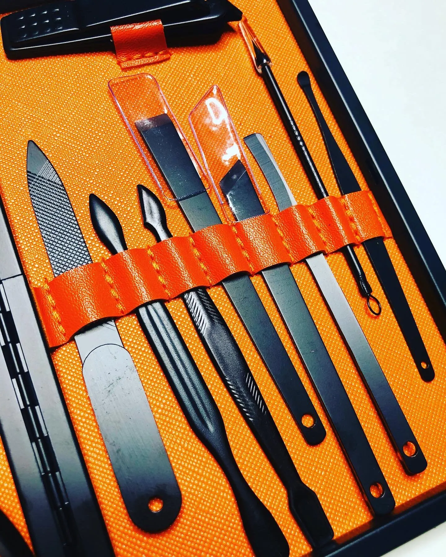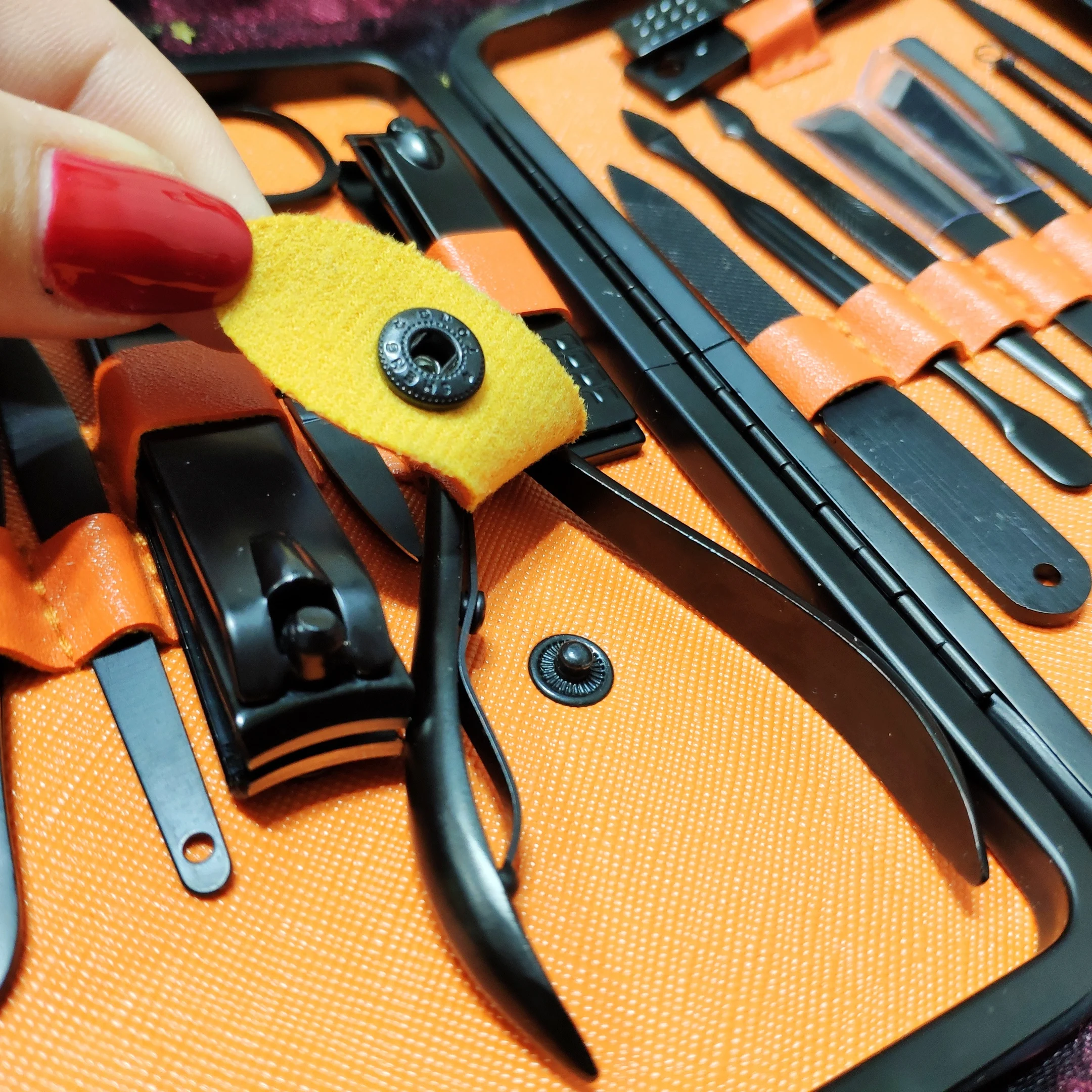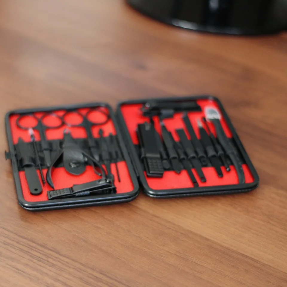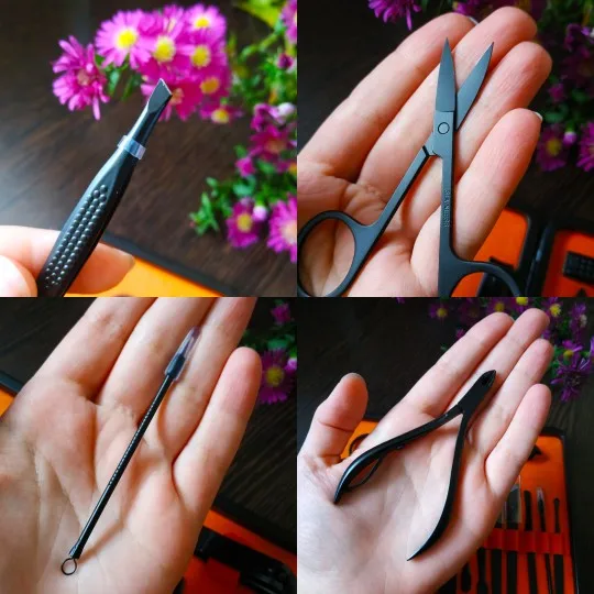 Маникюрный набор состоит из 18 предметов. Инструменты острые, хорошо режут. Не думаю что это профессиональный набор, скорее всего чёрное покрытие со временем облезет. Но своих денег точно стоит. Красивый и удобный футляр, всё на своём месте.