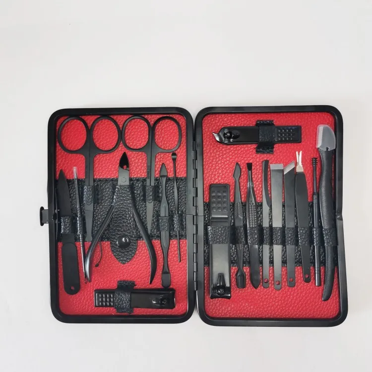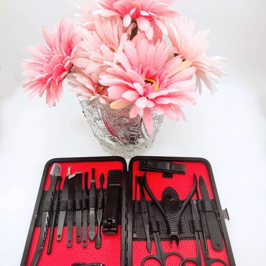 Шикарный маникюрный набор. Это не только маникюрный набор,но и педикюрный, также есть и другие предметы для ухода за собой. Футляр презентабельно выглядит, выполнен из качественного кожзама,открывается путем нажатия на кнопку. В наборе имеются кусачки для ногтей 3 размеров,ножницы с острыми концами,плоские и с закругленными концами, пинцеты,триммер ,палочка для ушей и т.д. Набор состоит из 18 предметов , изготовлены из нержавеющей стали ,по весу предметы тяжёлые. Такой набор не стыдно преподнести в подарок. Уже пользуюсь,очень довольна покупкой и смело рекомендую.