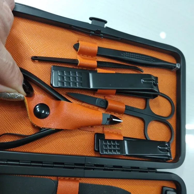 Набор приходит в футляре чёрного цвета, открывающегося нажатием на кнопку. Футляр из сплава, мягкий снаружи, внутри искусственная кожа желтого цвета, его размеры 15,5 на 10,5 см. В комплекте Ножницы Кусачки для ногтей кусачки для кутикулы пилка для ногтей Пинцет толкатель омертвевшей кожи нож для очистки ногтей прибор для чистки уха плоское средство для удаления мозолей средство для удаления мозолей зигзагообразное средство для удаления мозолей Игла для удаление черных точек/акне Набор отличного качества, изготовлены из премиум-класса TainlessСталь. Из стали сделано все, кроме триммера, ручка у него пластиковая. Ножницы, кусачки острые, тяжёлые, приятно держать в руках. Набор очень понравился, можно взять в подарок, очень добротно выглядит.
