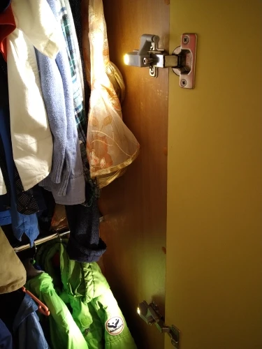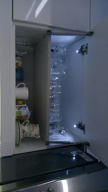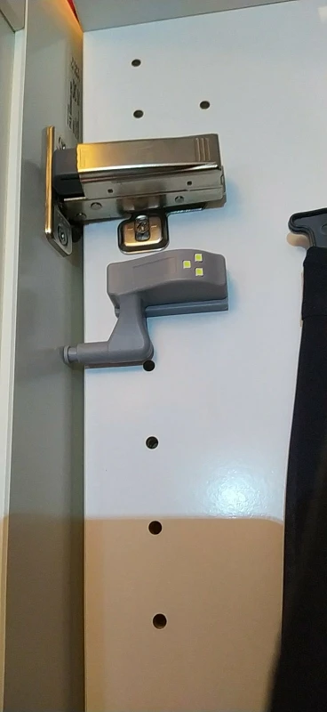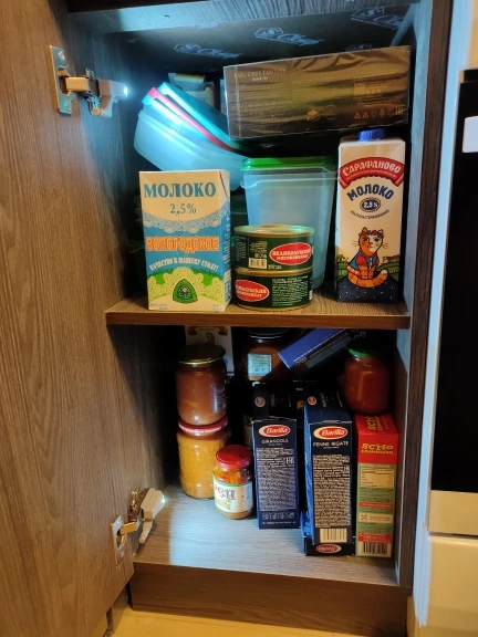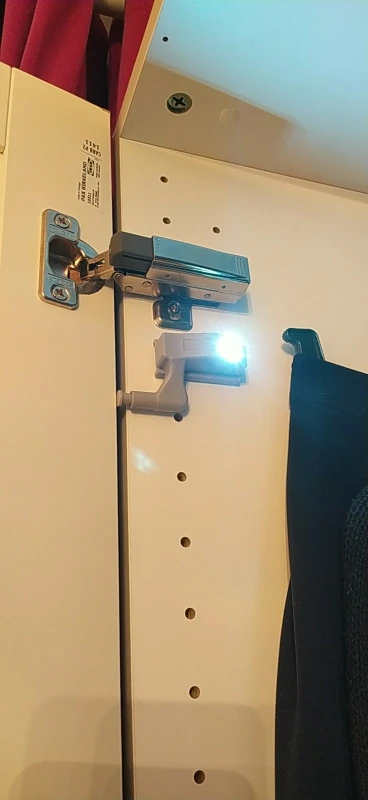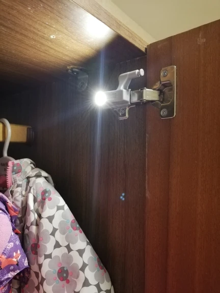 Не ко всем петлям подходит. Нужно немного пропилить внутри, чтоб сдвинуть основание кзади - светильник упирается в петлю и мешает закрываться. А так вполне достойное освещение, в ночи шкаф как на ладони.