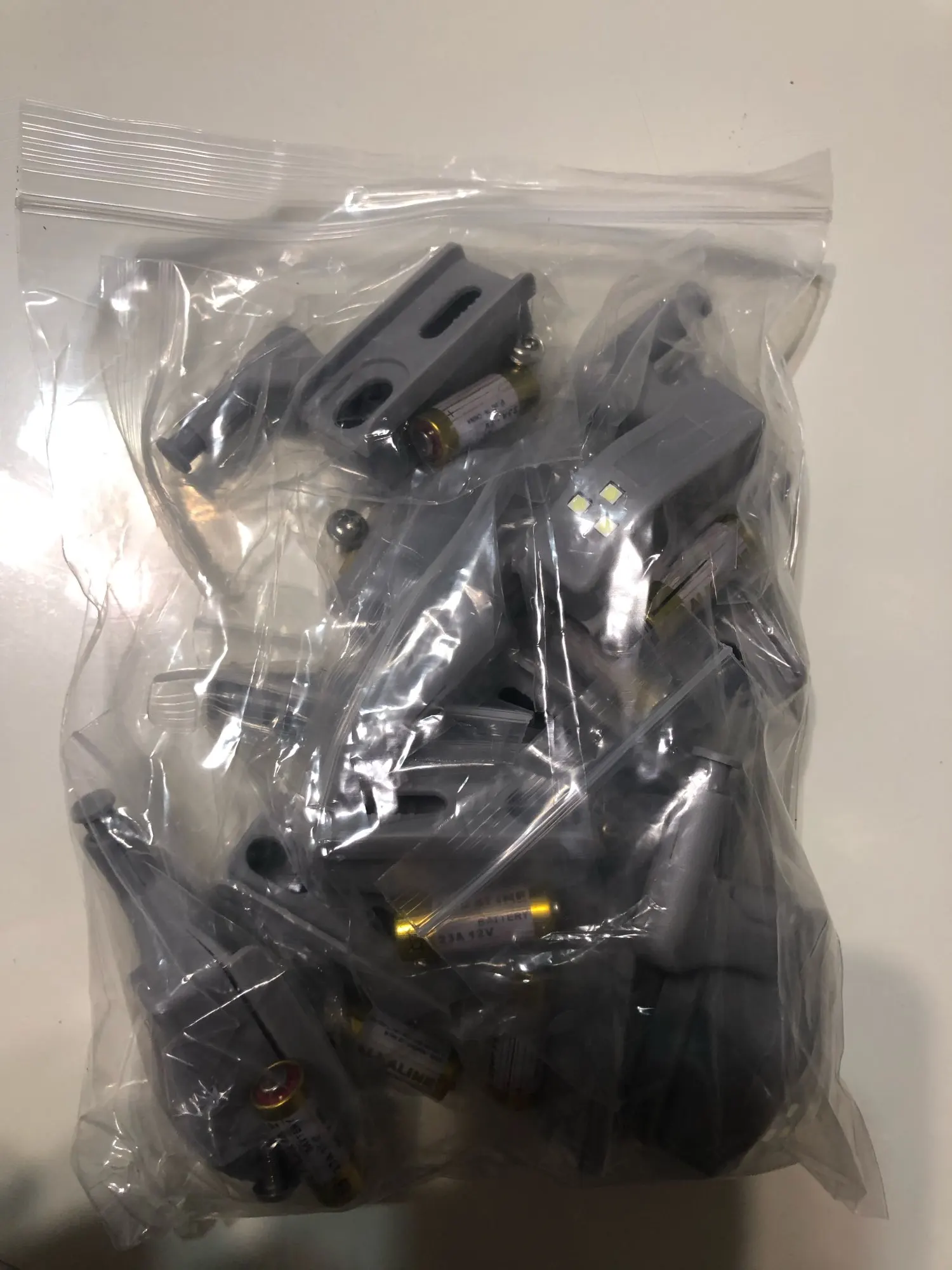 Все доставили в срок. Батарейка используется не очень доступная, А23 12 вольт. Ашан и т.д. продают от 120 ₽. В магазине электрики купил по 40₽. Все работает.