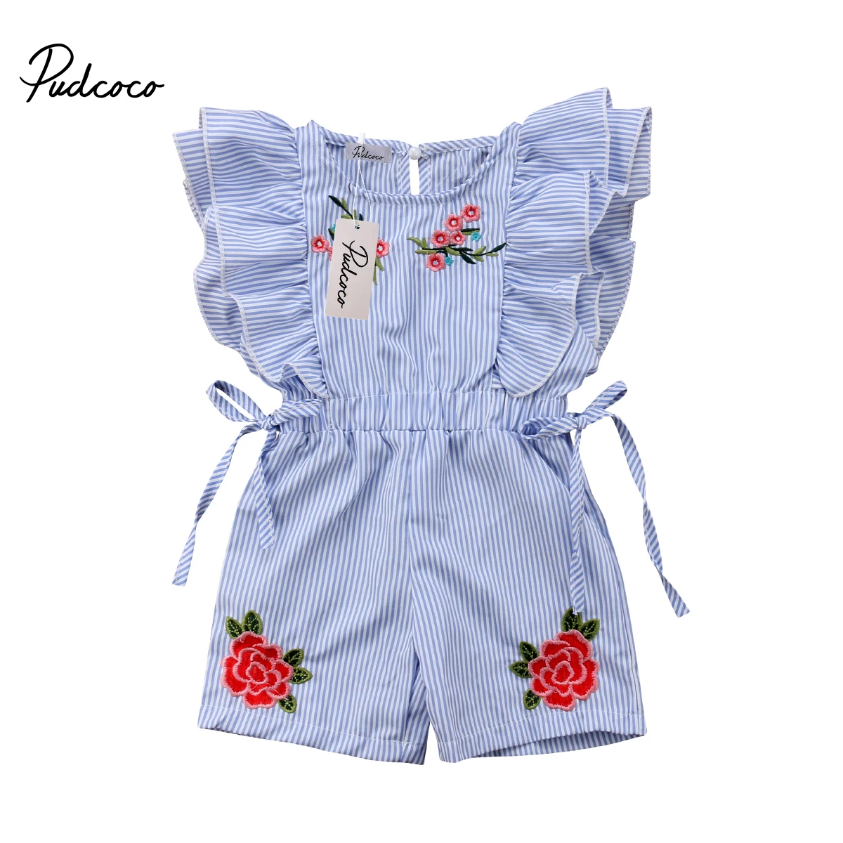 Комбинезон детский, летний, с коротким рукавом-лепестком, с поясом на резинке, в полоску, с цветочным принтом, 2018