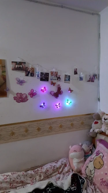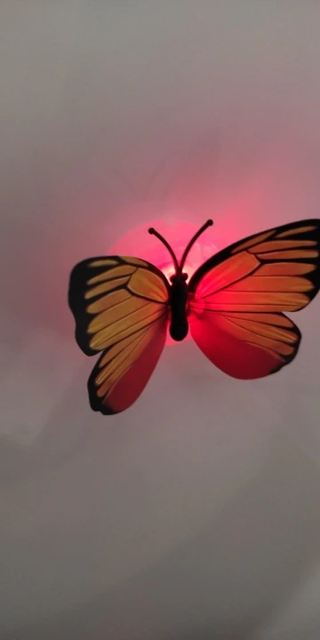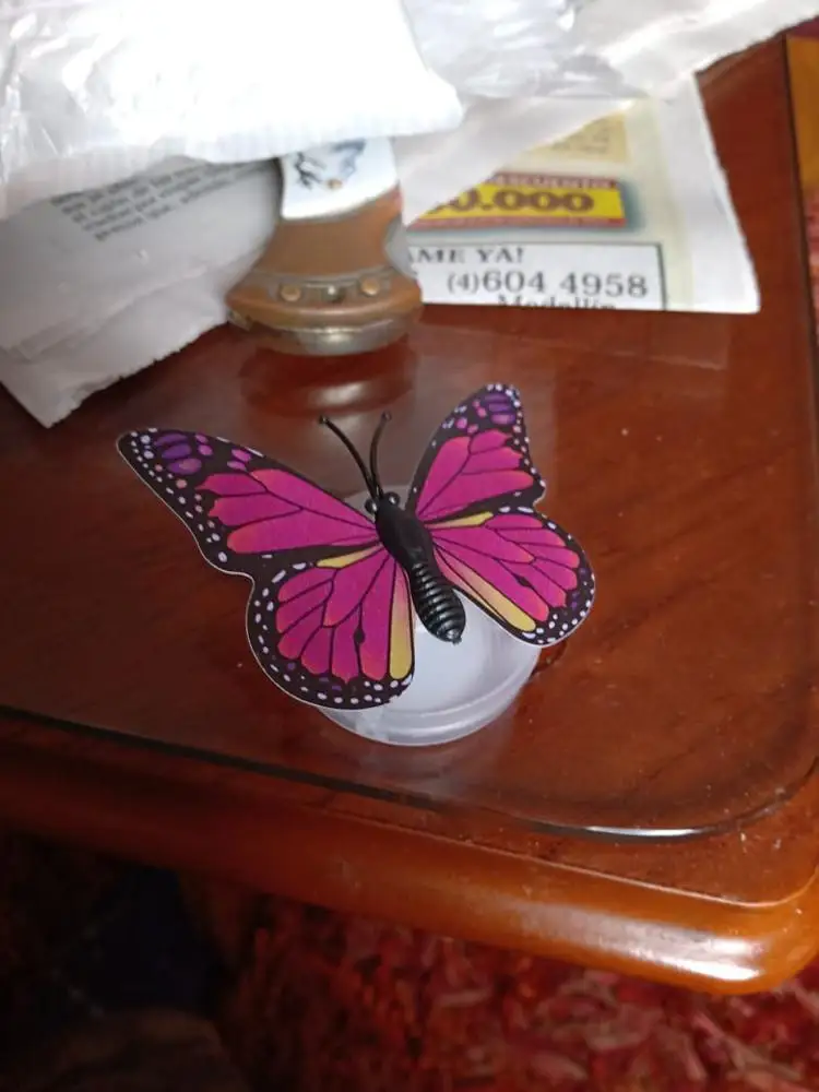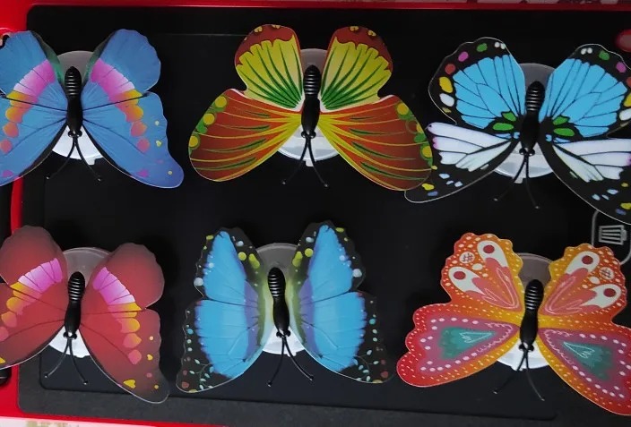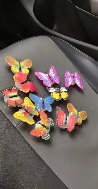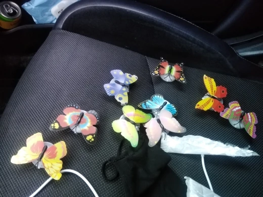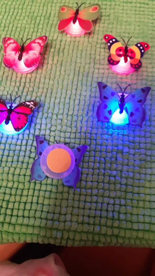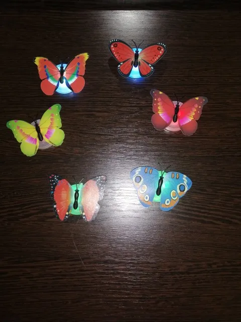 долго шли и наконец получила, бабочки меньше чем кажатся на картинке, две одного цвета и одна из них не горит, обидно. Посажены на клей, внутри три маленькие батарейки, и двусторонний скотч. Но все равно товаром довольна.