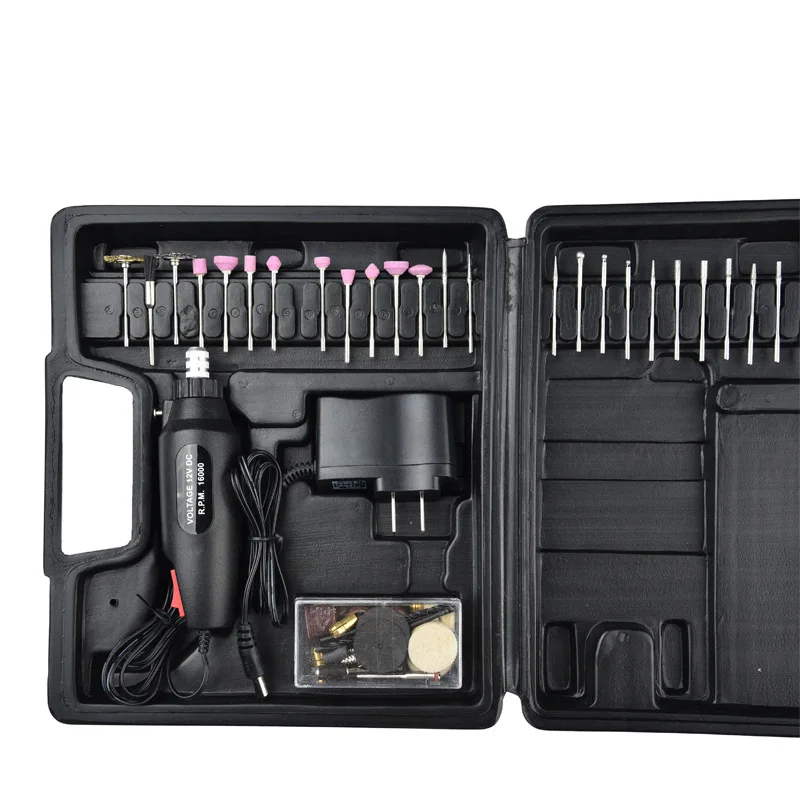 Особенность: Аксессуары 60 шт. Вилка BS и адаптер GS Одобрено GS/CE/EMC Трансформатор можно использовать при подключении к трансформатору. Длина провод для трансформатора-1,8 метров, а длина провода маленькой электродрели-1,2 метров. Напряжение: 12 В Скорость холостого хода: 16000 об/мин Минимальный зажим 1,6 мм, максимальный 3,2 мм Размер коробки: 22*19*6 см Вес: около 550 грамм Посылка: Стальная проволочная щетка, щетка из медной проволоки, Шлифовальная головка для нейлоновых щеток, Шлифовальная головка из сплава, сверло для стружки из смолы, шлифовальный лист для масляной шерсти, шатун для кольца из наждачной бумаги и т. д.(Пластиковая коробка в комплект не входит)