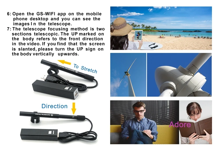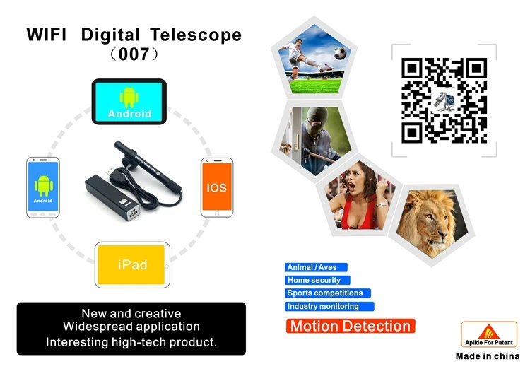 Это очень забавный и интересный электронный продукт, который полон черных высоких технологий. Это мини-портативный и широко используемый. Его объем так же мал, как ручка. Он интегрирует Беспроводное подключение, оптические телескопы и сенсорный светильник. Он может подключаться к вашему телефону Android, Apple мобильный телефон, планшетный ПК, IPAD byWIFI. Это позволяет легко наблюдать отдаленные пейзажи непосредственно на этих устройствах, конечно, вы также можете использовать его для съемки, так что вы можете смотреть назад в любое время.