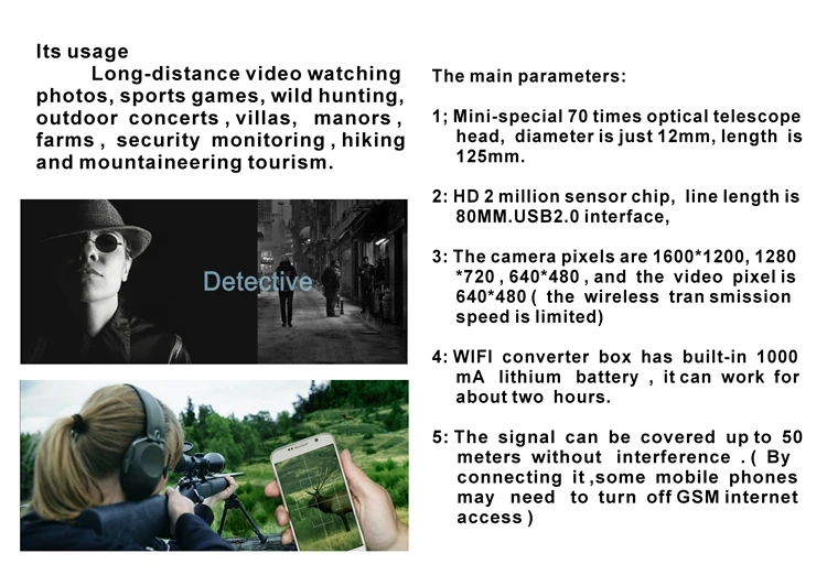 Видеосъемка на дальние расстояния, просмотр фотографий, спортивные игры, Дикая Охота, открытые концерты, виллы, горы, фермы, мониторинг безопасности, туризм и горный туризм.
