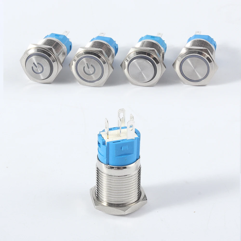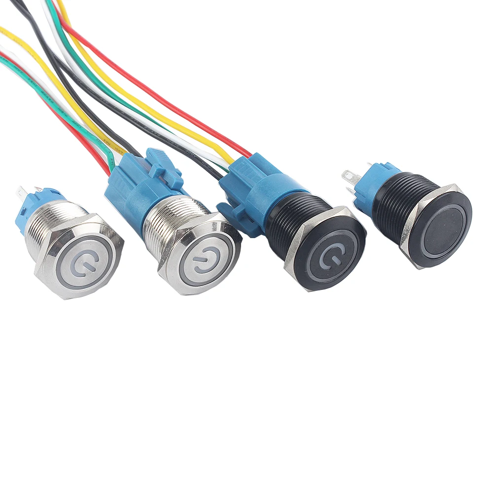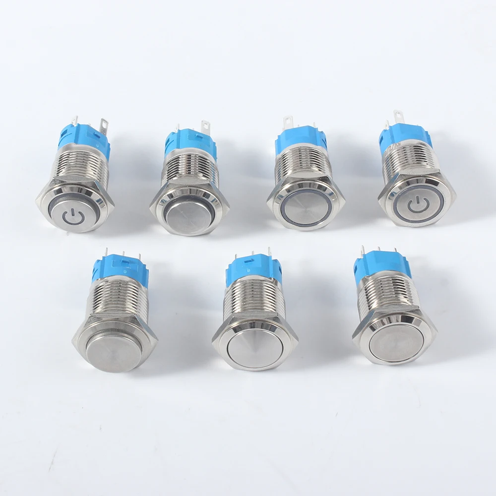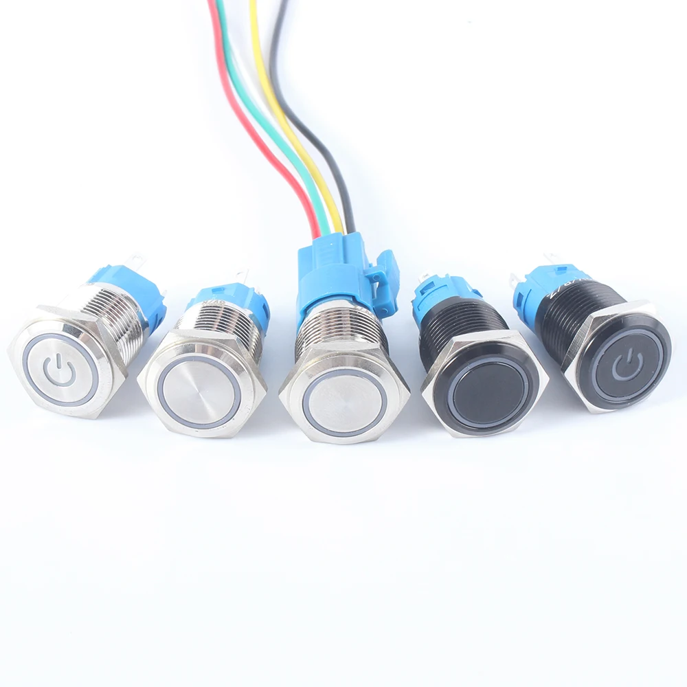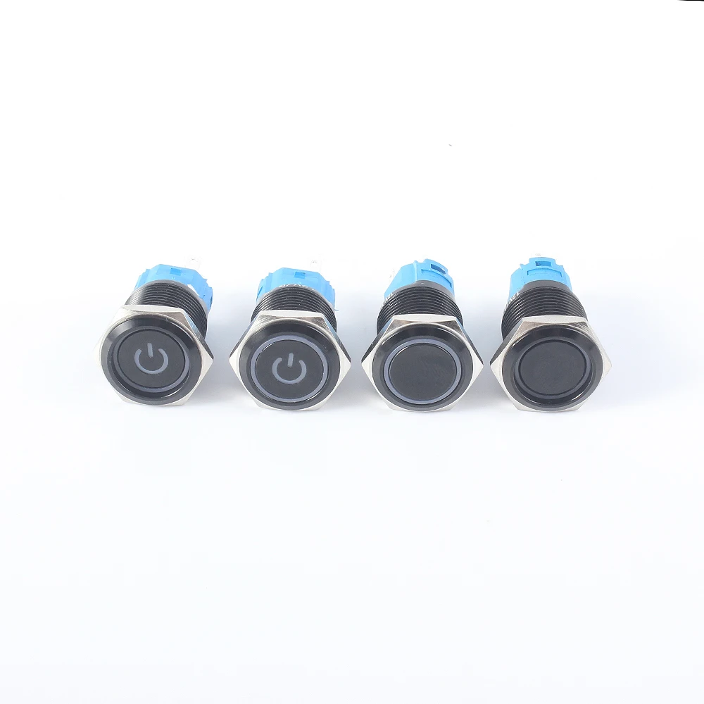 Металлический кнопочный переключатель с фиксацией, 16 мм, черный, моментальная перезагрузка, водонепроницаемый, светодиодный индикатор питания, кольцевая лампа 1NO 1NC, красный, синий, 5 В, 12 В