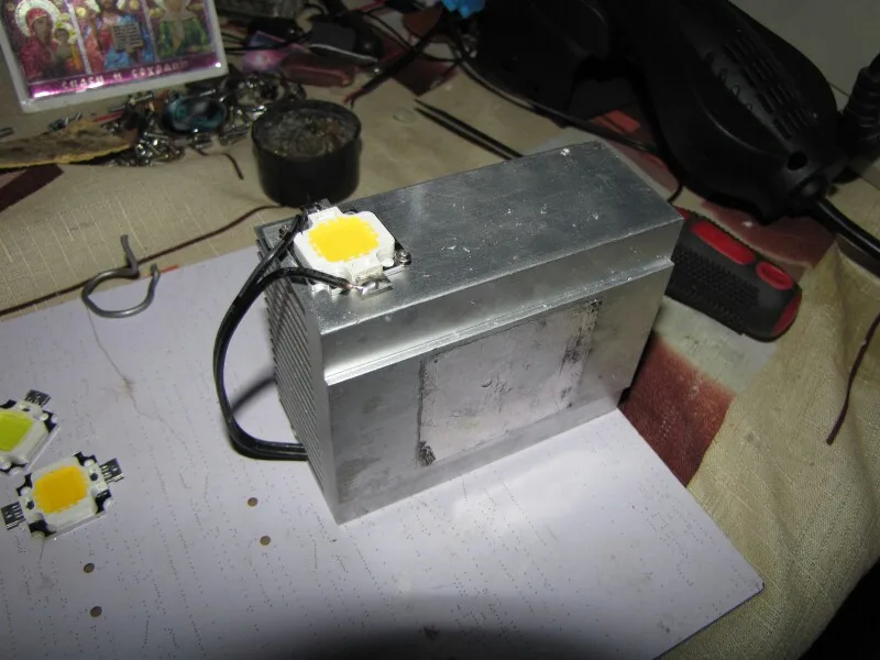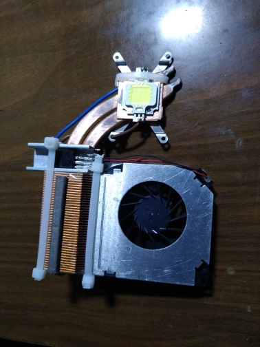 товар надійшов майже через місяць з моменту замовлення, був у звичайному конверті, з піною. тепер про саму світлодіодну збірку: на одній підложці розташовано 9 кристалів, загораються вони при 7-8 В, прожектор починає доволі яскраво світити при 9-10 В, при тому нагрівання не значне, а вже при 12-ти вольтах споживає майже 1.5 А і дуже сильно нагрівається, тому потрібно кудись це тепло відводити, зате світить як треба. мною на швидку руку був зроблений такий бутерброд із системи охолодження ноутбука і стабілізатора напруги на 5 В (для живлення кулера), який ви можете бачити на фото, в подальшому планую переробити цю халабуду на щось нормальне. підсумок: прожектор працює, як треба, замовленням я задоволений, можу сміливо рекомендувати