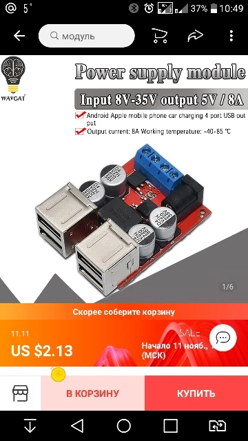 Продавец прислал модуль, отличающийся от того, что на сайте. Открыл спор. Сразу решили в мою пользу. Решил проверить модуль и был приятно удивлен! При входном напряжении 12 вольт, на выходе получил 5.01 вольт и 8.7А В нагрузке! При этом, слегка нагрелся входной диод, остальное было теплое! Модуль на фото. Так что, можно смело заказывать и такие модули. Рекомендую! Прислал очень быстро.