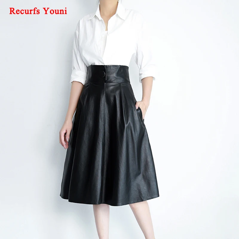 Женская Зимняя юбка-зонтик RY8312 из натуральной кожи с карманами на пуговицах и высокой талией, Женская Милая юбка, 70 см длинная, на молнии, большая задница, коричневая юбка