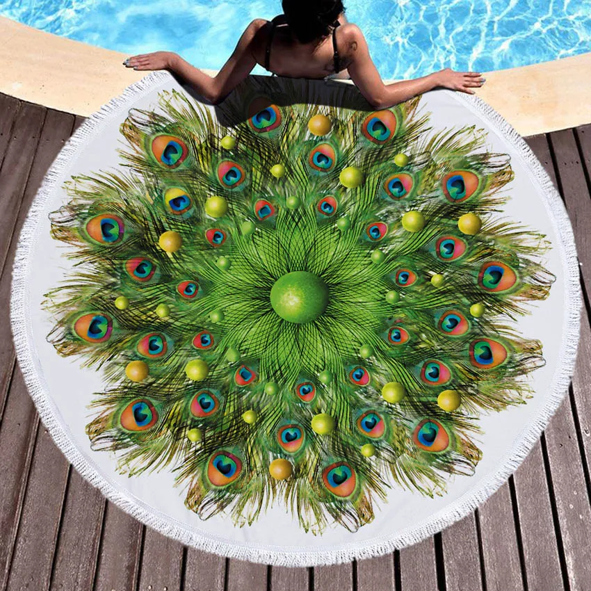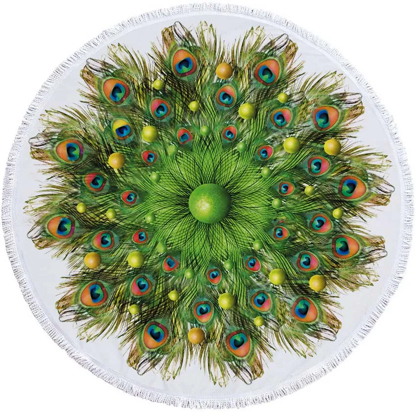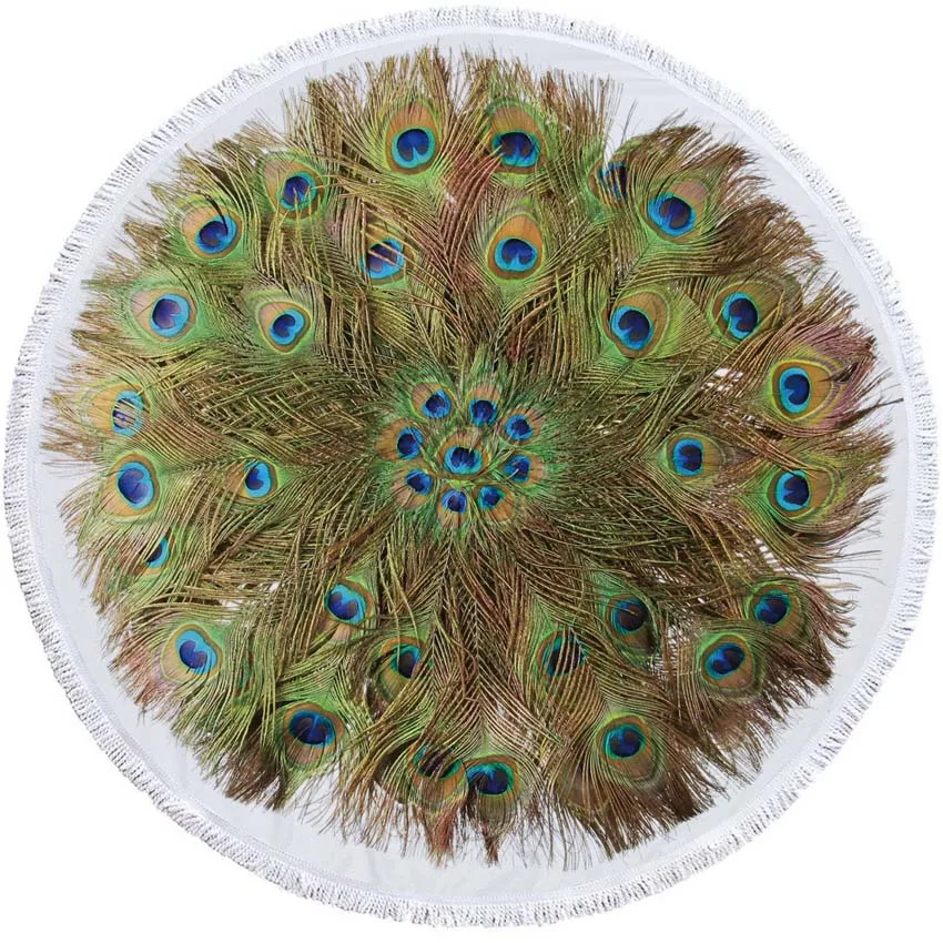 Круглое пляжное полотенце с кисточками, банное полотенце из микрофибры с перьями павлина для взрослых, коврик для пикника и йоги, одеяло, накидка, 150 см