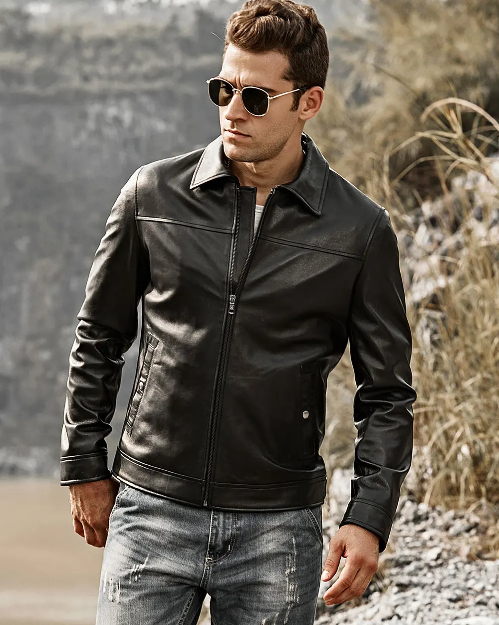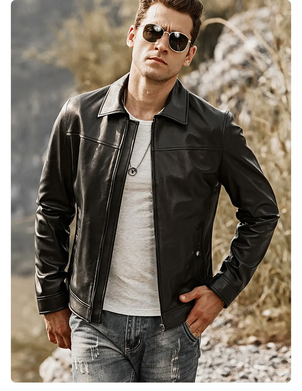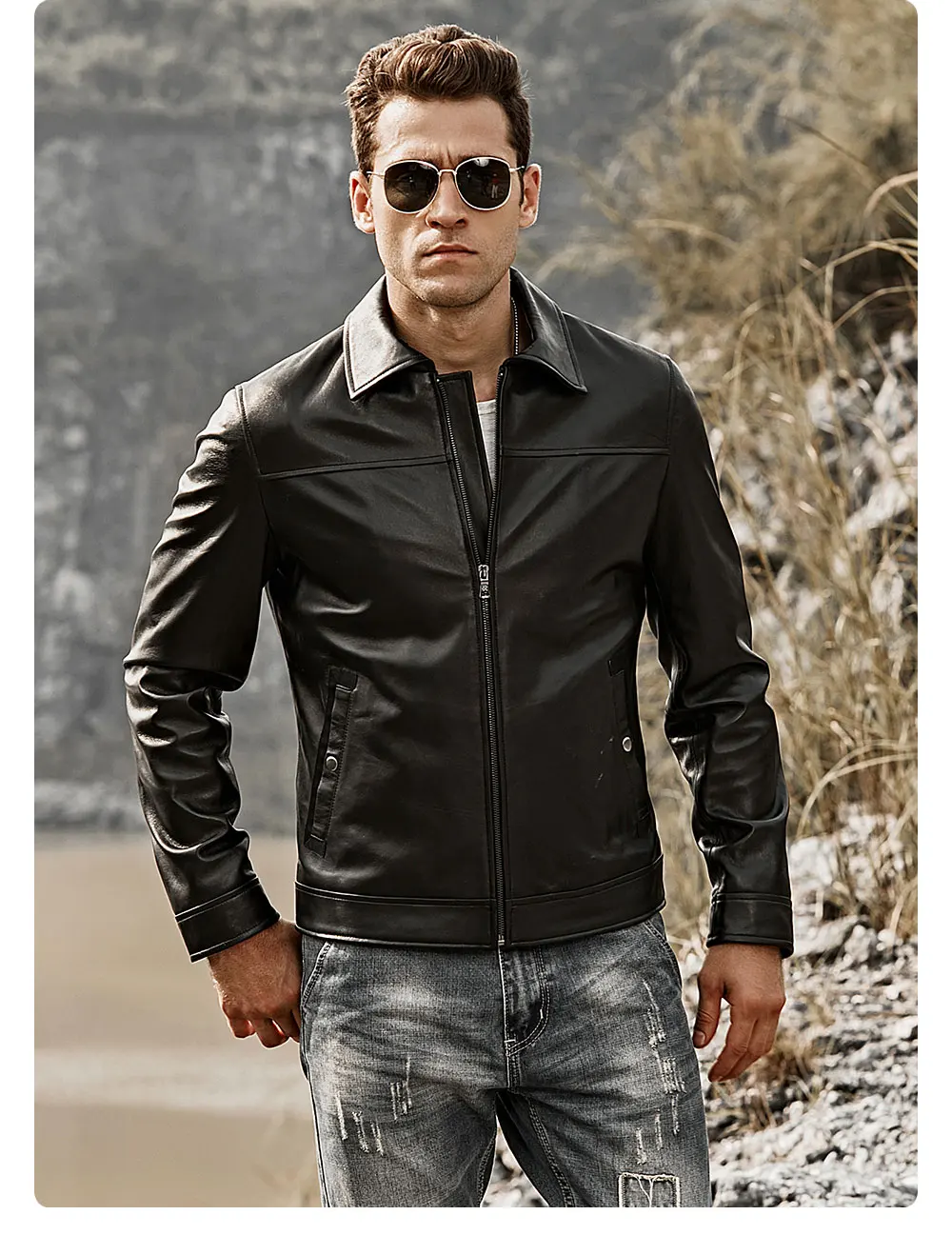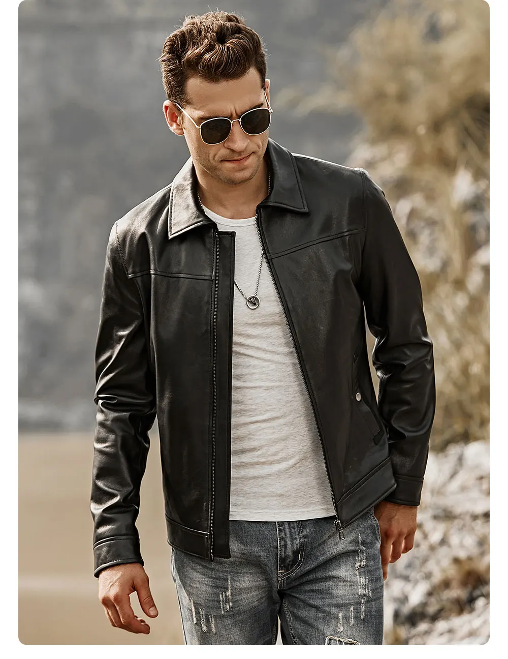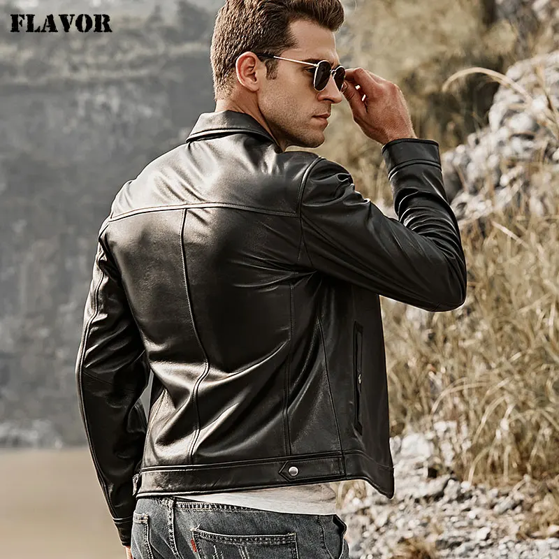 Kожаная куртка мужская с отложным воротником FLAVOR, кожаная мотоциклетная куртка из шкуры ягненка, жакет из натуральной кожи черного цвета, 2018