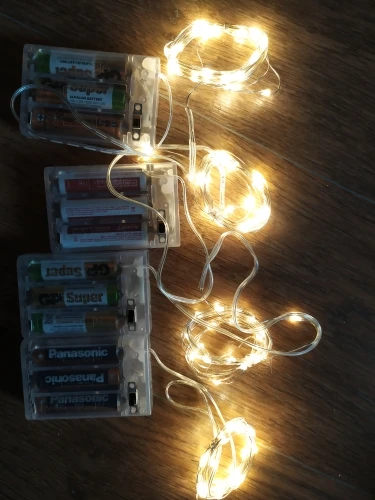 Потрясная гирлянда! Батарейки в комплекте не идут, но вас не заставит труда купить обычные пальчиковые. Их нужно 3 штуки. Лампочки гирлянды светятся очень ярко. По факту - это проволока с маленькими диодами, но выглядит хорошо за свои деньги.