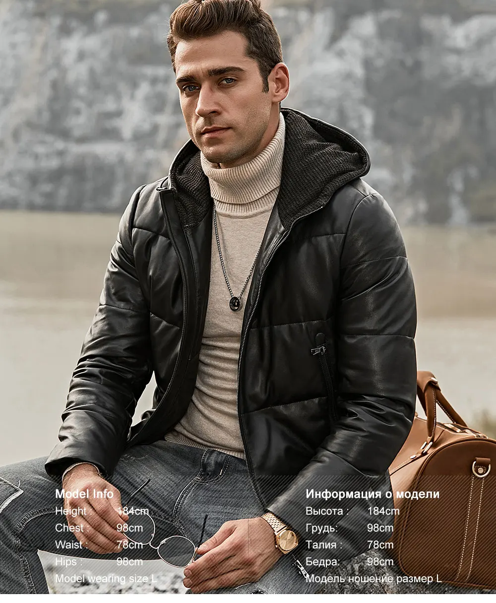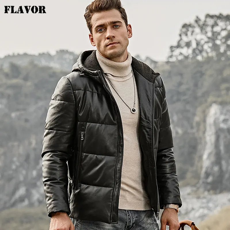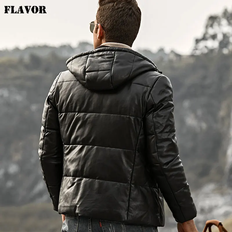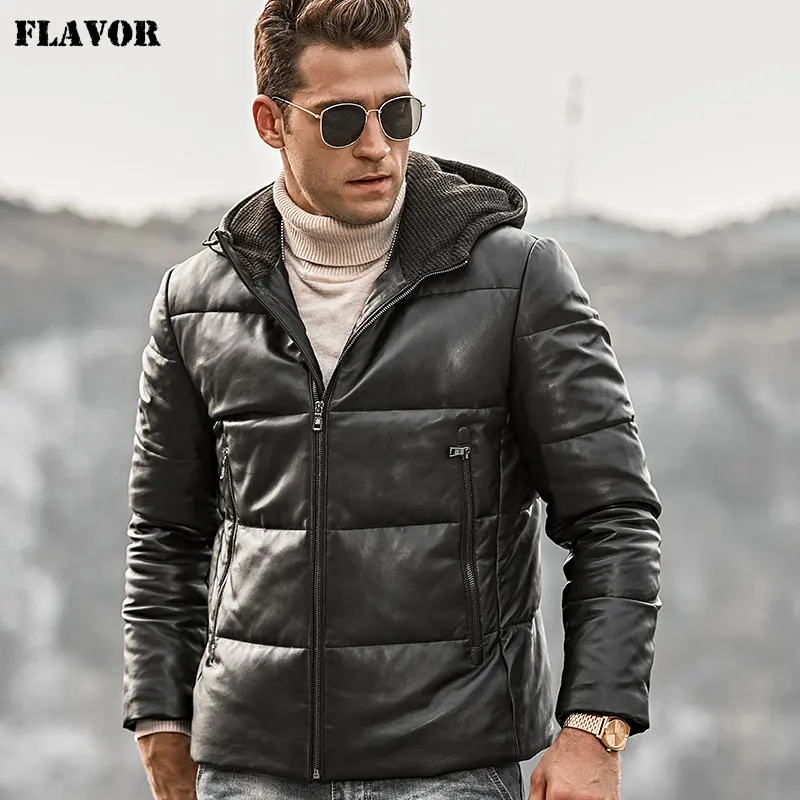 Мужской кожаный пуховик из овечьей шкуры FLAVOR, байкерское теплое кожаное пальто с капюшоном для зимы
