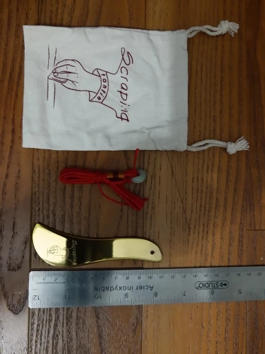 Хороший скребок, металлический тяжеленький, края гладкие , упакован в тканевый мешочек
