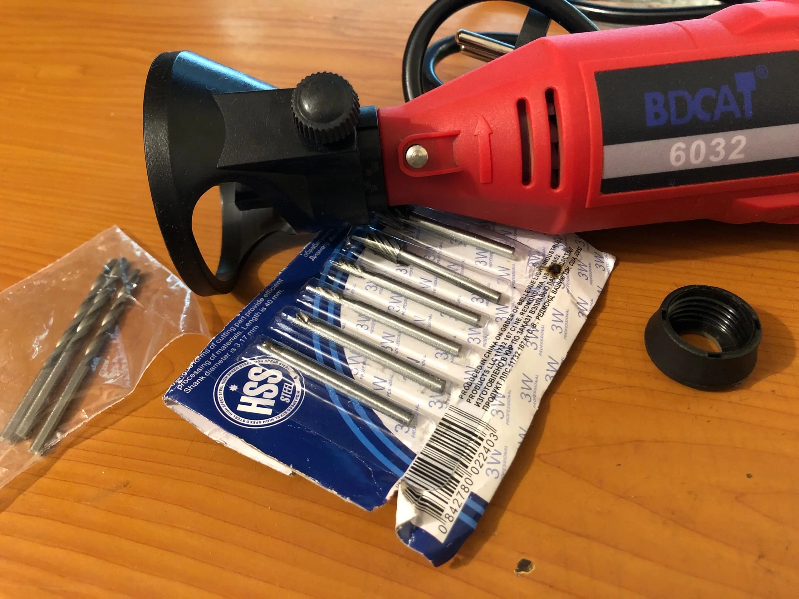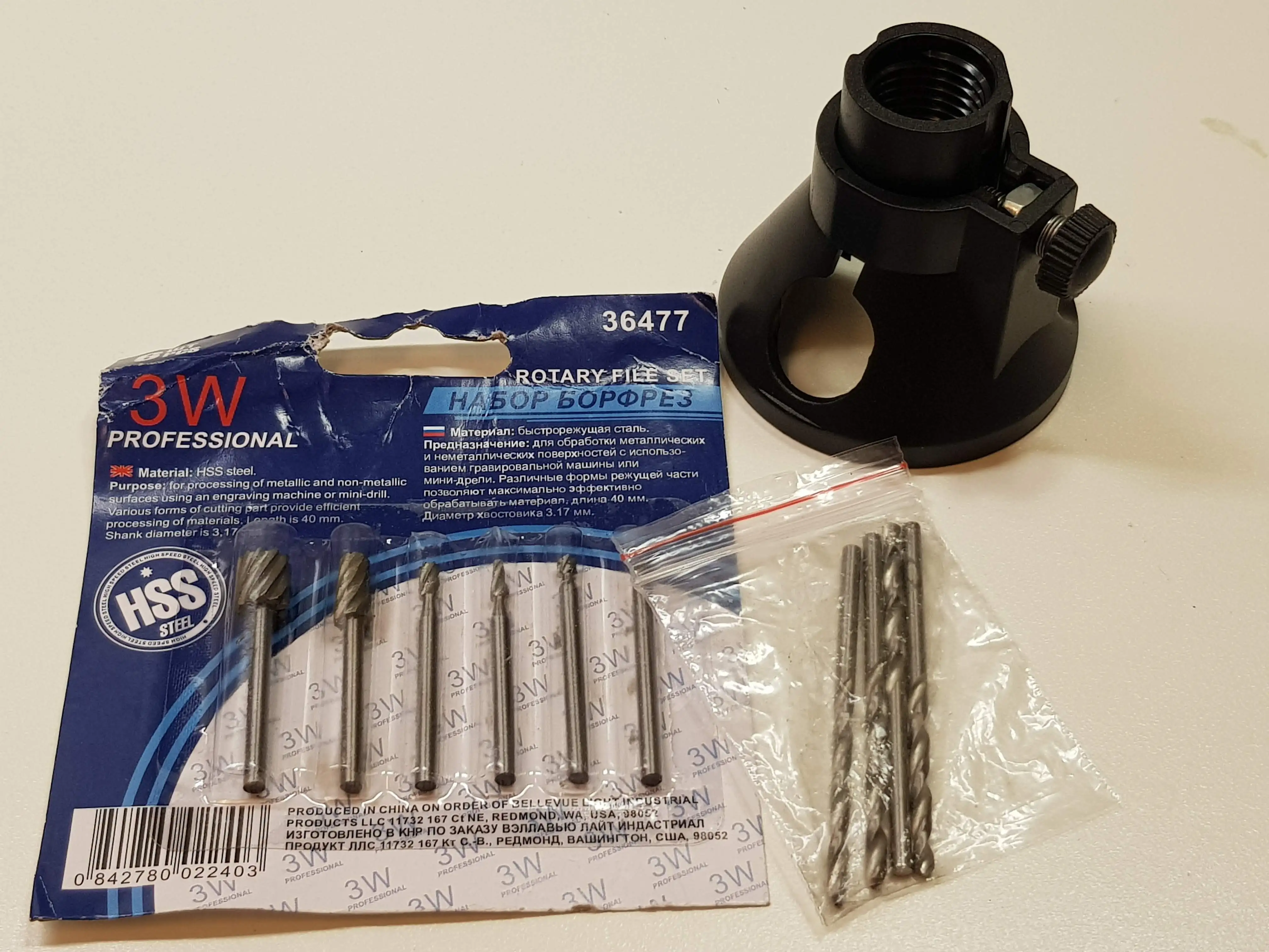 доставка быстрая до Ярославля чуть больше недели, отслеживался. качество фрез не очень,за такую цену чего и следовало ожидать,одна качественная фреза стоит дороже, насадка с большим люфтом на фото.х видно,но если есть руки то можно его убрать. пластик нормальный