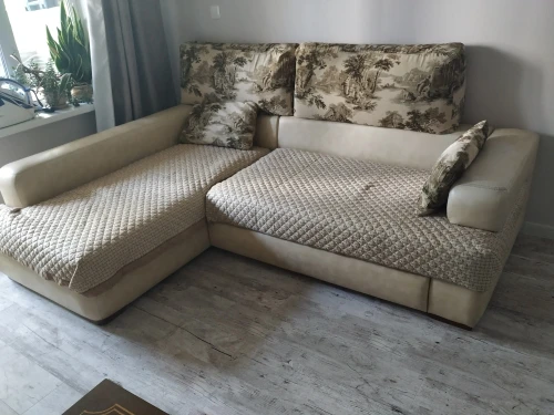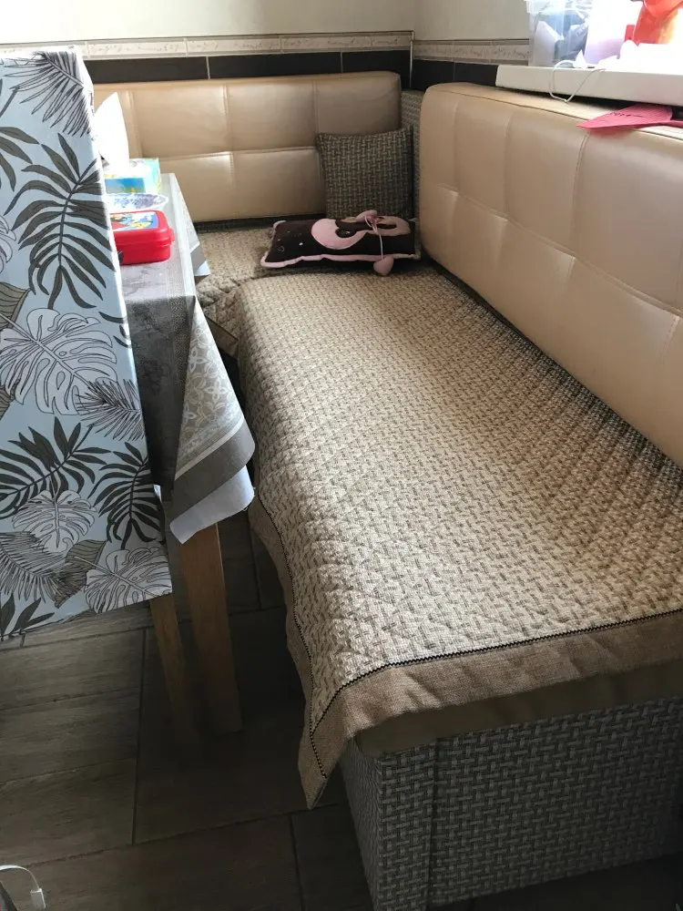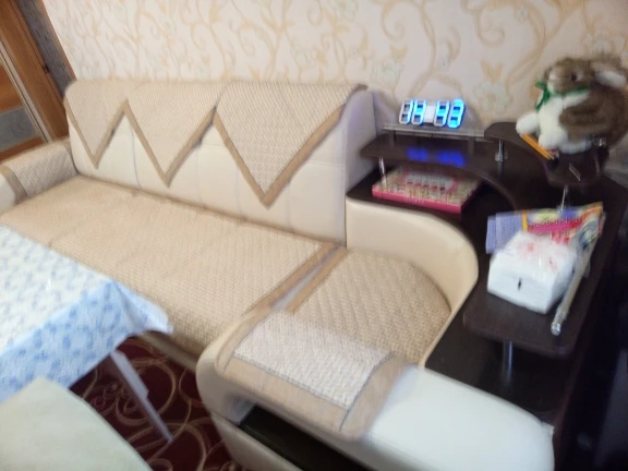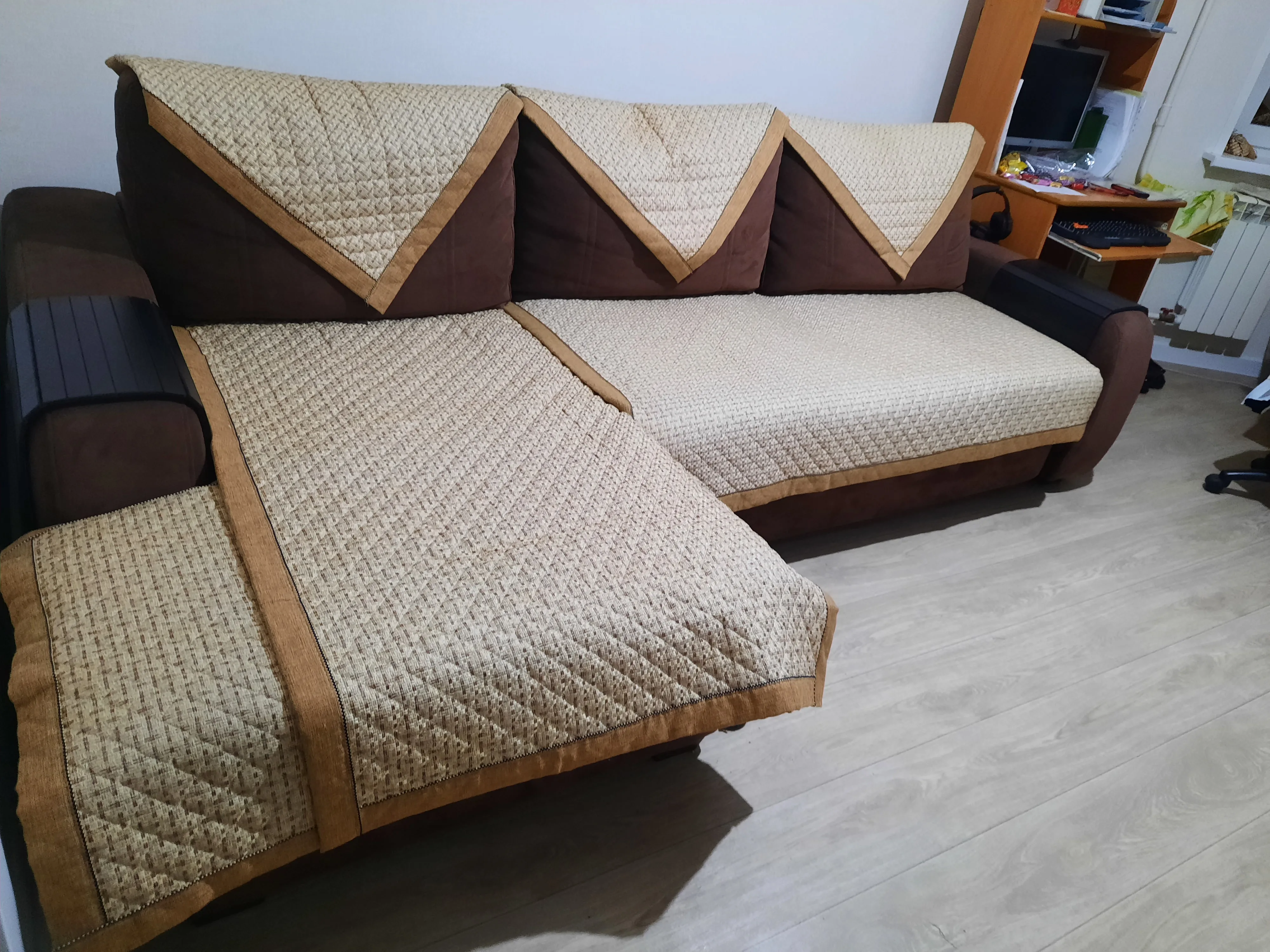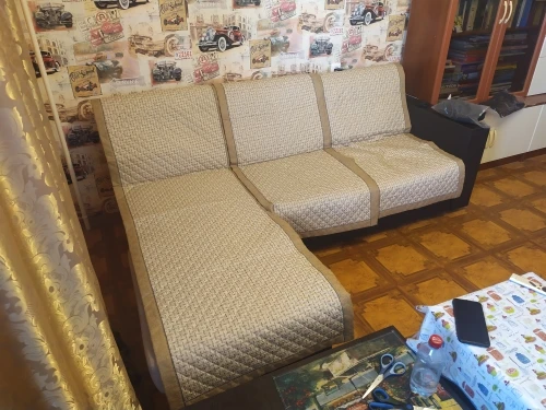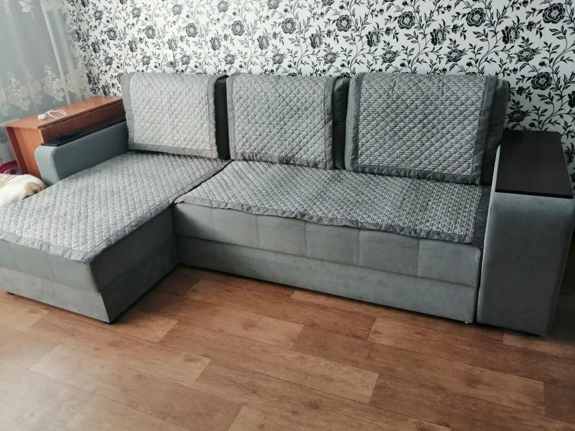 Пришло на почту в течении месяца. Везде отслеживалось. Разложили в 2 тюка-пакета. Прошито аккуратно, нитки не торчат, материал плотный, соответствует цвету на фото. Теперь диван выглядит аккуратно и не будет пачкаться. Всем удачных покупок, быстрых и целых посылок!!!