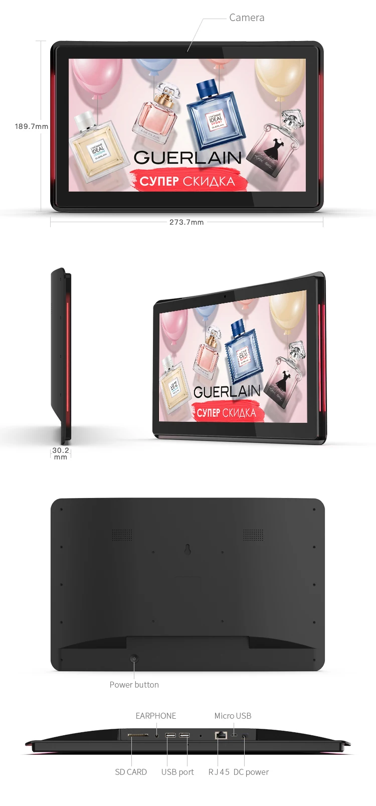 Системы ЦПУ: RK3288, четырехъядерный cortex A17, 1,8G Оперативная память: 2 ГБ DDR3 Внутренняя память: 16 Гб Операционная система: Android 8,1 Дисплей Панель: 15,6 "ЖК-IPS-панель Разрешение: 1920*1080 Активная область: 344,16 (H) x193.59мм Угол обзора: 89/89/89/89(L/R/U/D) Режим отображения: обычно черный, IPS Коэффициент контрастности: 800 Яркость: 250 кд/м2 Соотношение сторон: 16:10 Сенсорный экран: 10-точечный емкостный сенсорный Сеть Wi-Fi: 2,4G 802.11b/G/N Порт Ethernet Lan: 100M/1000M ethernet Bluetooth: Bluetooth 4,0 Интерфейс Слот для карты: SD-карта USB: USB-хост Micro USB: Micro USB OTG USB: USB для последовательного RJ45 с POE: RJ45 POE: IEEE802.3at/af Разъем питания: Вход питания постоянного тока Наушники: наушники 3,5 мм + микрофон Формат медиа Формат видео: MPEG-1,MPEG-2,MPEG-4,H.263,H.264,VC1,RV и т. д., поддержка до 4K Аудиоформат: MP3/WMA/AAC и т. д. Фото: jpg Прочие ожерелья и подвески VESA: 100*100 мм Динамик: 2*1,5 Вт Светодиодная панель: зеленый, синий, красный Камера: 2,0 M/P, фронтальная камера Рабочая температура: 0-40 градусов Язык: многоязычный Размеры продукта: 401,81*30,2*252,91 мм