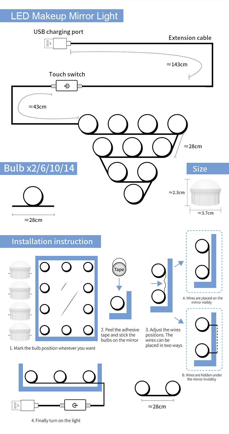 *Предусмотрены двухсторонние ленты и присоски, лампочки могут быть непосредственно и быстро наклеены на зеркала с лентами или присосками.